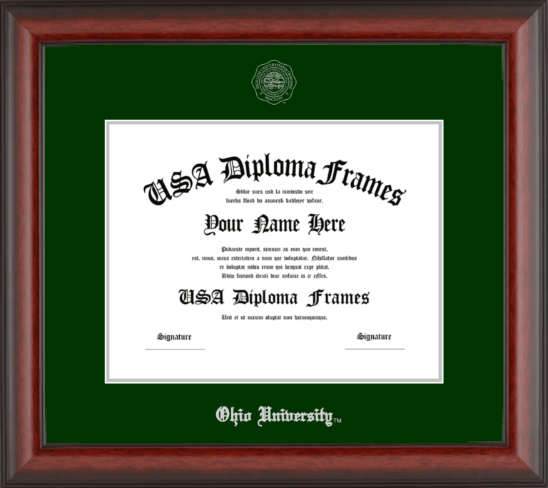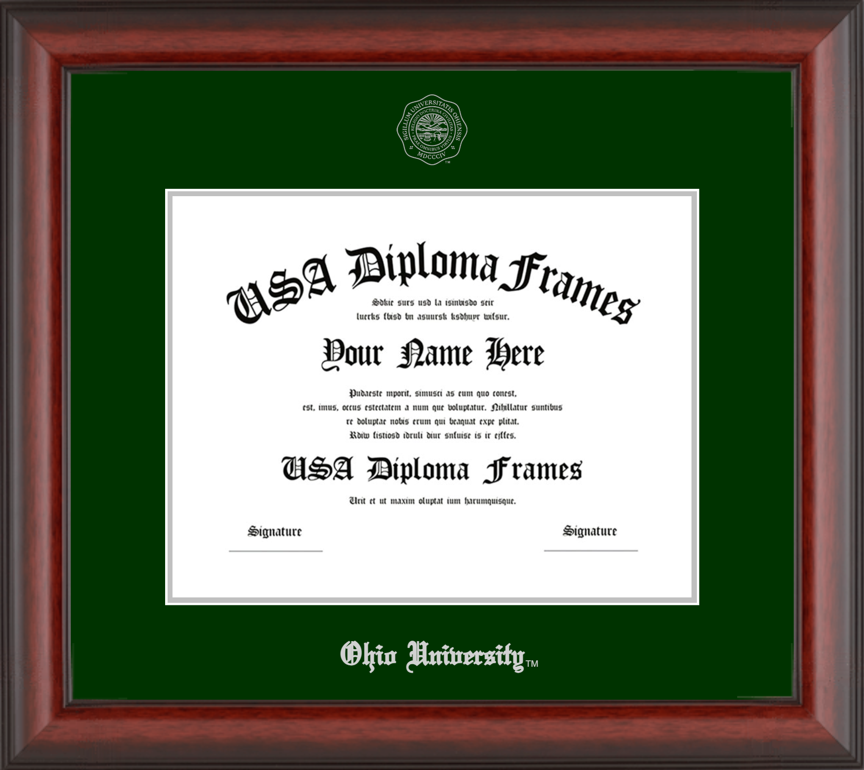 Ohio University Diploma Frame – Cherry Mahogany Matte – Winter Green and Silver Mat