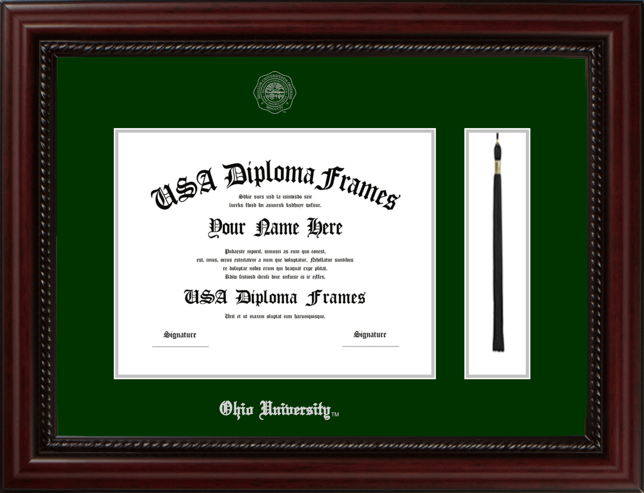 Ohio University Diploma Frame with Tassel – Executive Cherry Rope – Winter Green and Silver Mat – Silver Seal
