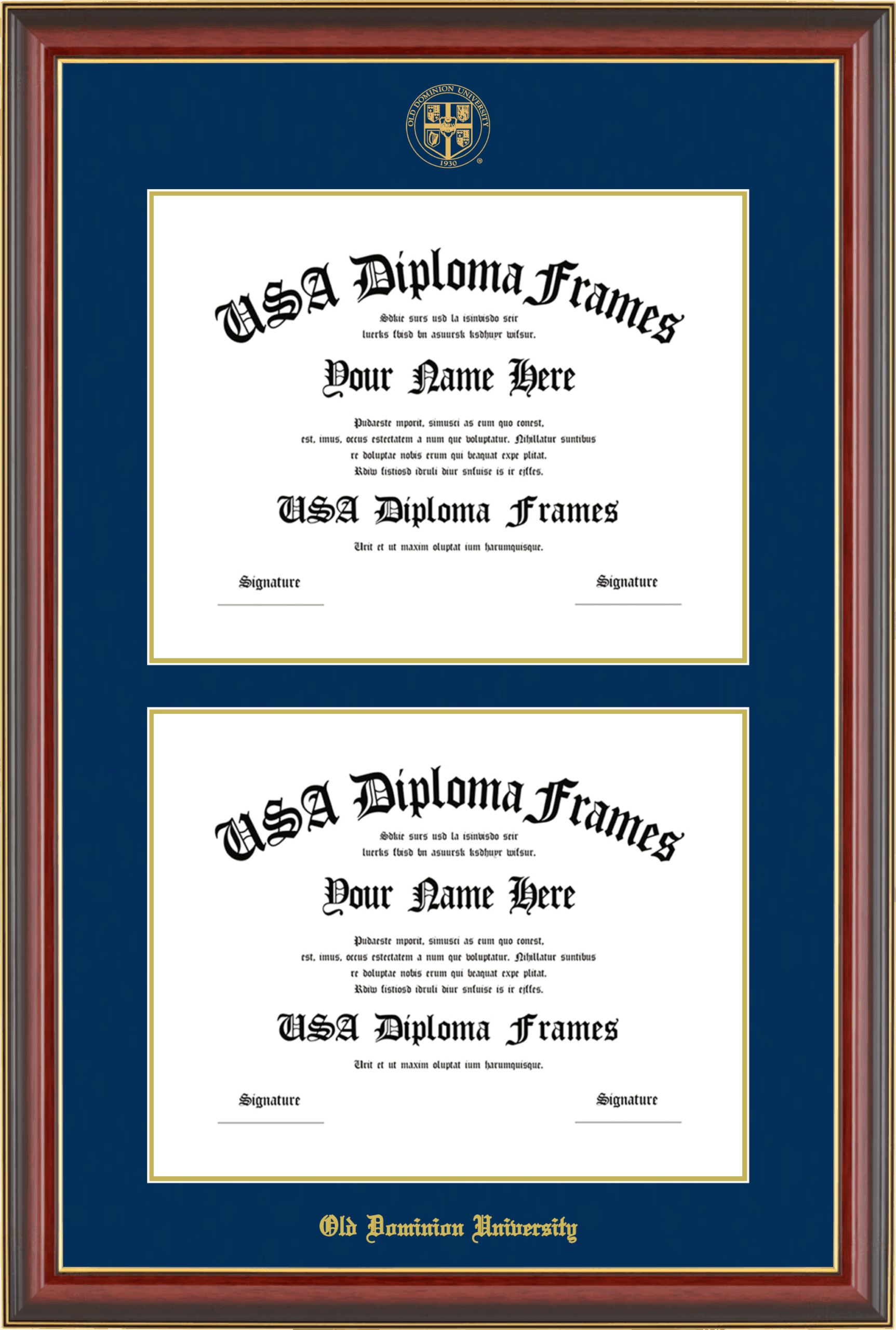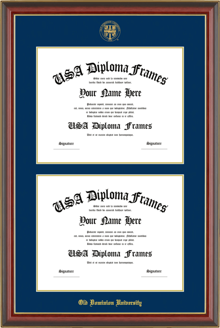 Old Dominion University Double Diploma Frame – Double Document – Cherry Mahogany Gold Trim Glossy – Navy and Gold Mat