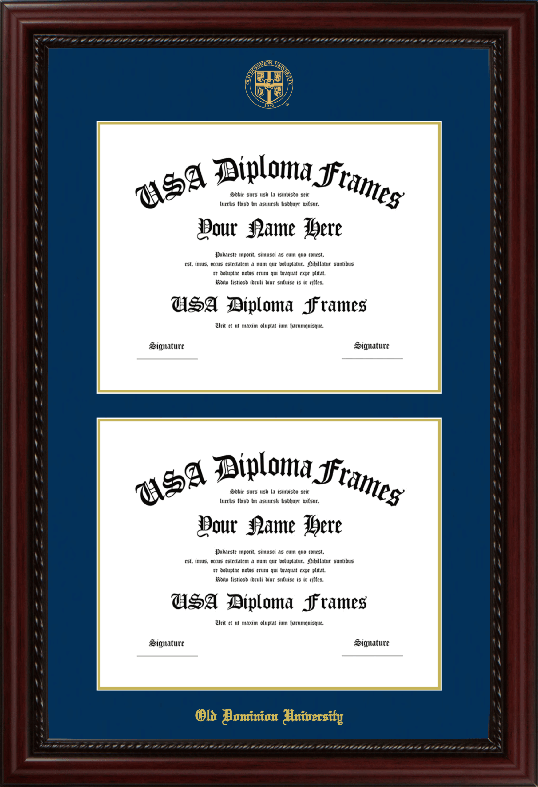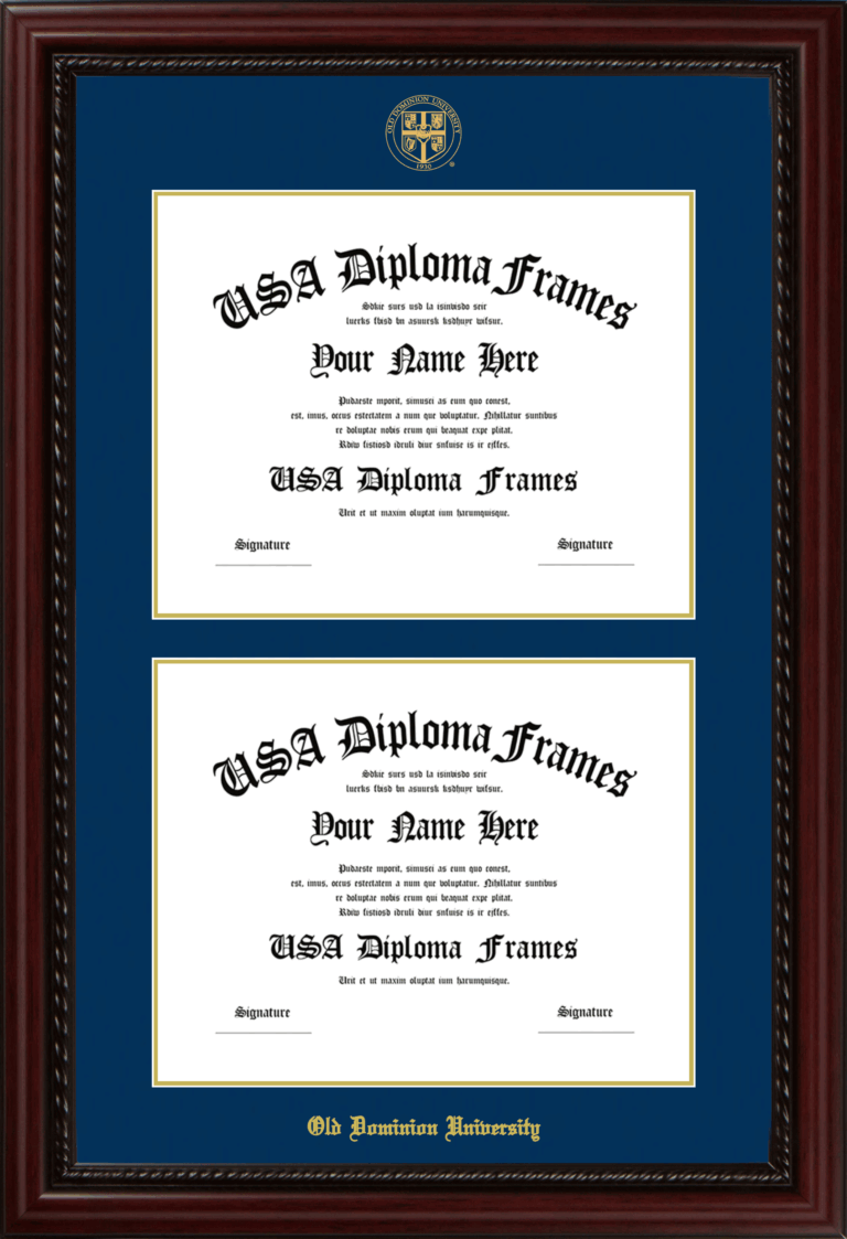 Old Dominion University Double Diploma Frame – Double Document – Executive Cherry Rope – Navy and Gold Mat