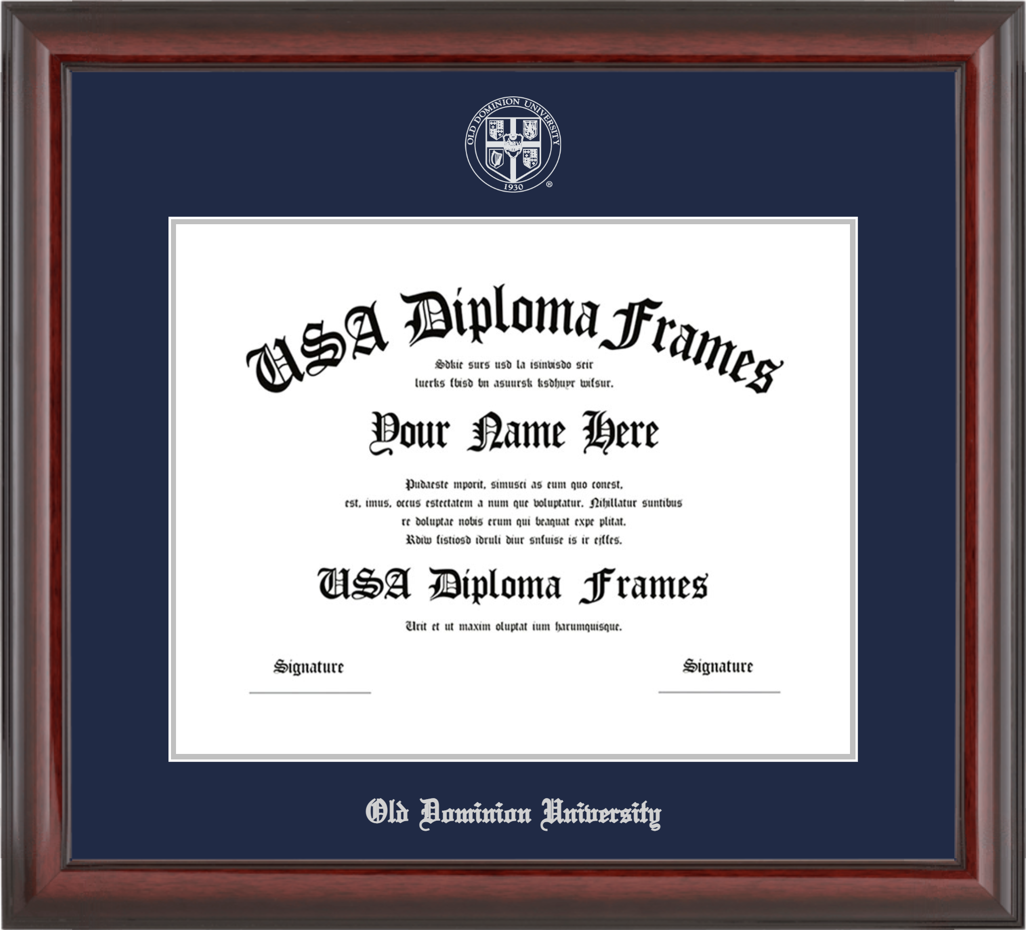 Old Dominion University – Single Horizontal Document ( Diploma ) – Cherry Mahogany Glossy – Navy Mat – Silver Accent Mat – With Seal(University Seal Silver) – With Silver Embossing (Old Dominion University)