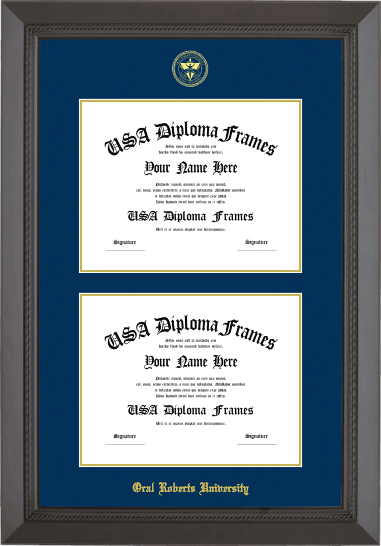 Oral Roberts University Double Diploma Frame – Double Document – Black Rope – Navy and Gold Mat