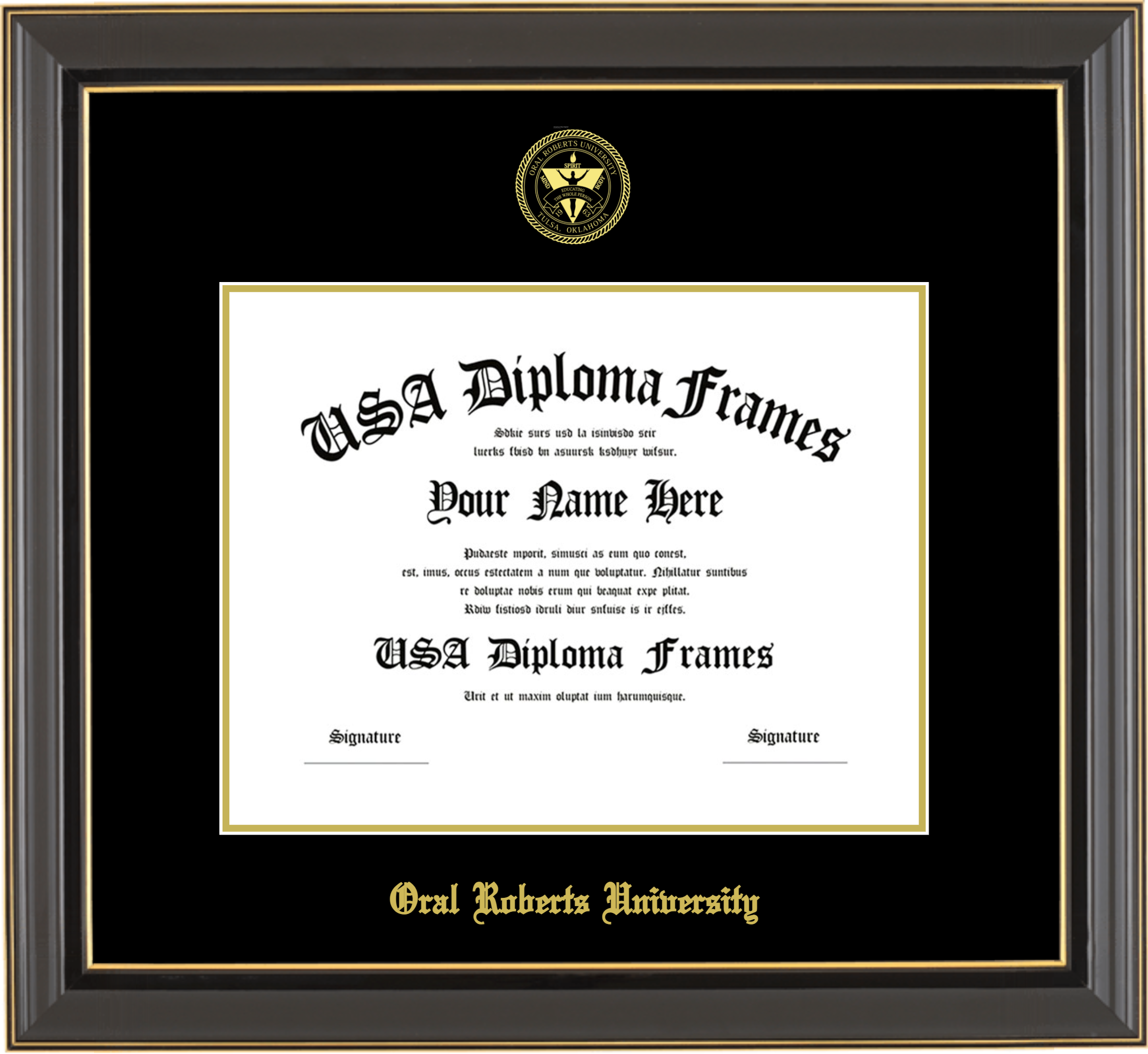 Oral Roberts University Diploma Frame – Black Gold Trim Glossy – Black and Gold Mat