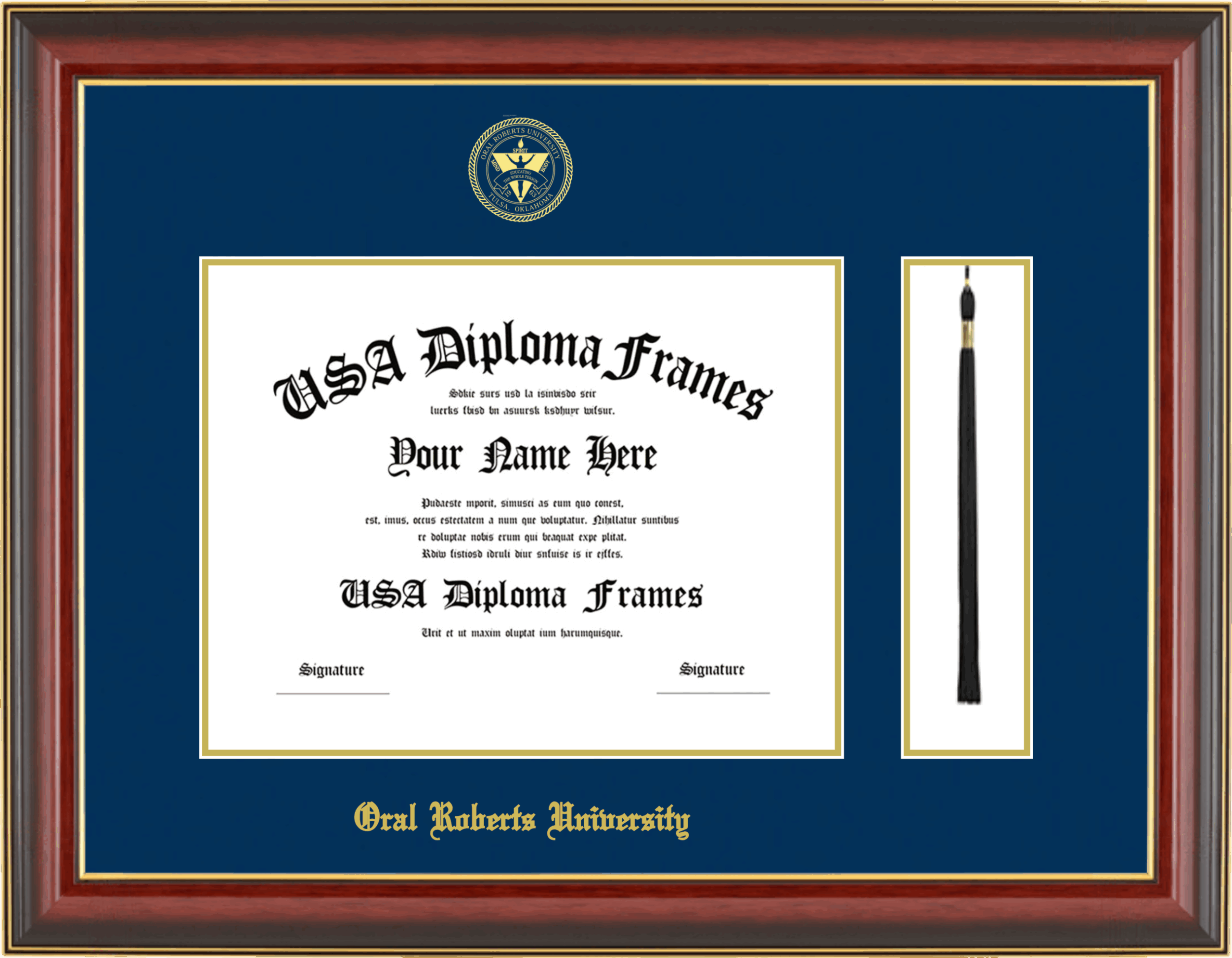 Oral Roberts University Diploma Frame – Cherry Mahogany Gold Trim Glossy – Navy and Gold Mat