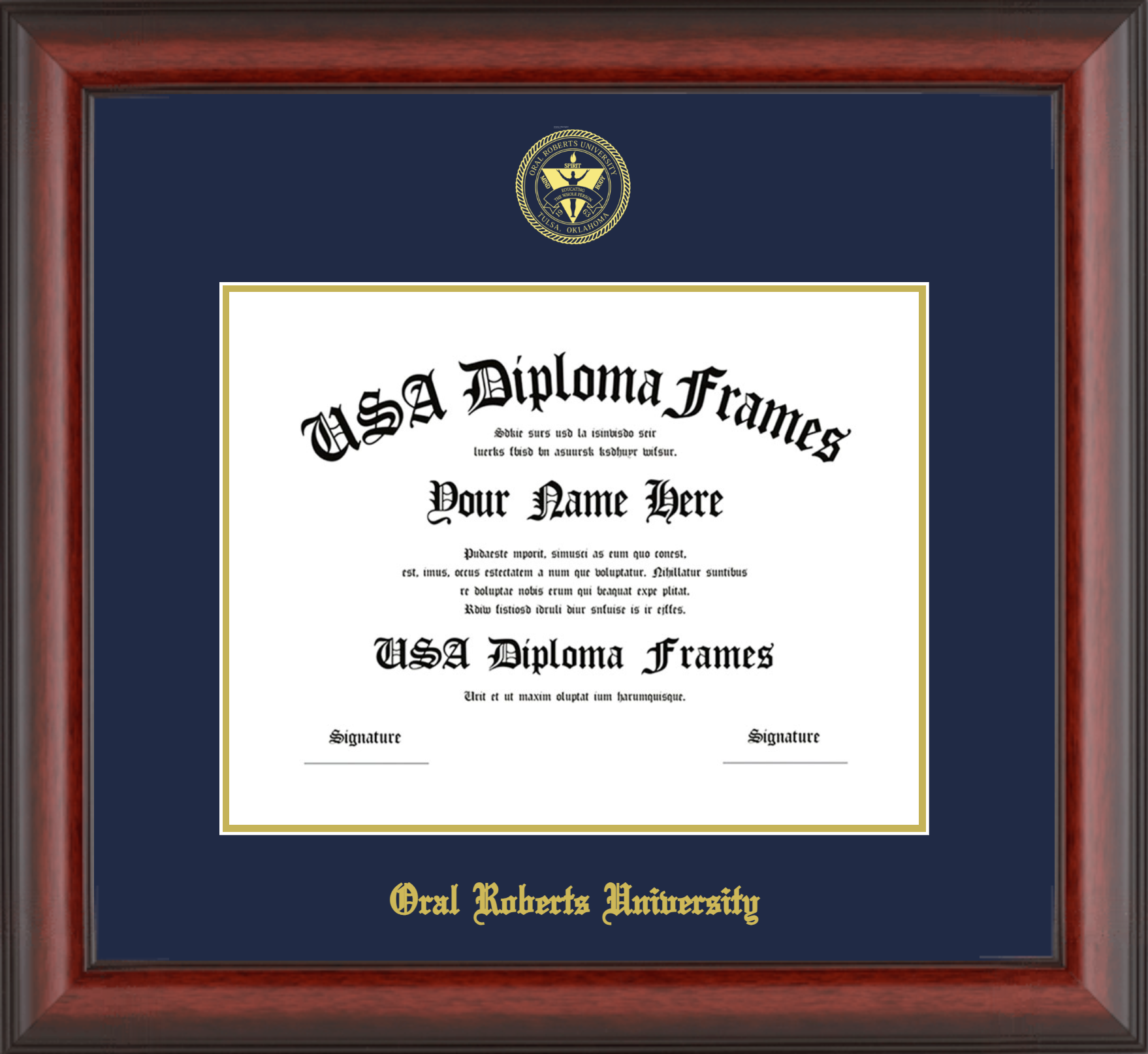 Oral Roberts University – Single Horizontal Document ( Bachelors ) – Cherry Mahogany Matte – Navy Mat – Gold Accent Mat – With Seal(University Seal Gold) – With Gold Embossing (Oral Roberts University)