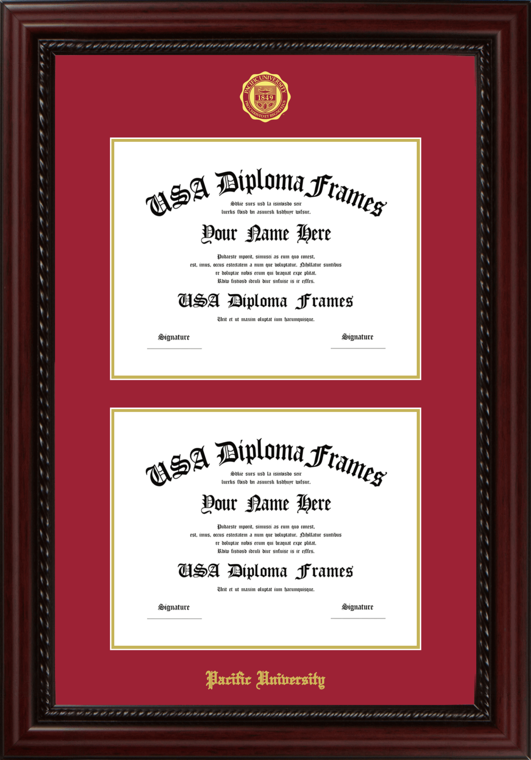 Pacific University Double Diploma Frame – Double Document – Executive Cherry Rope – Crimson and Gold Mat