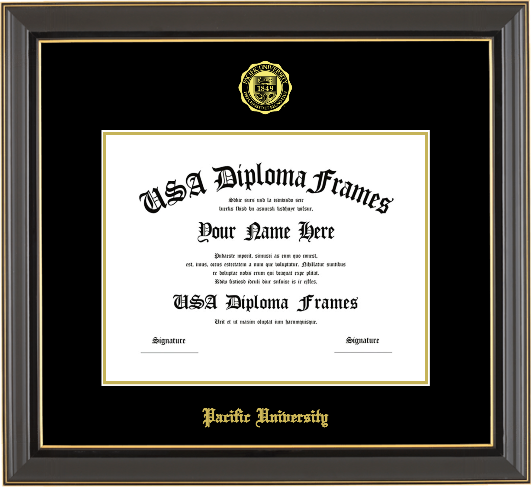Pacific University Diploma Frame – Black Gold Trim Glossy – Black and Gold Mat