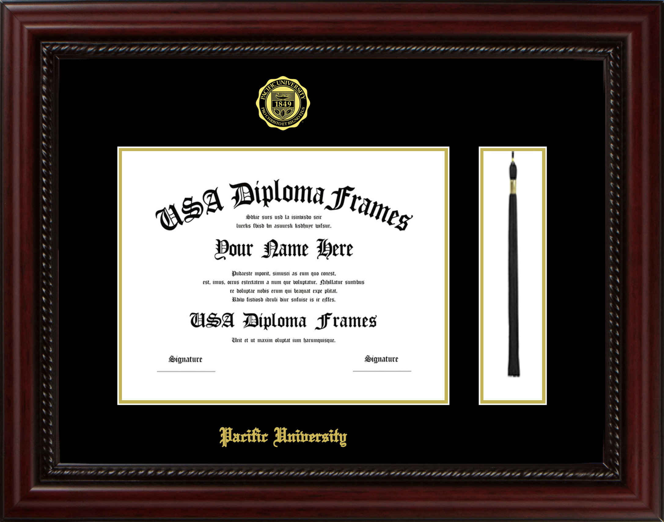 Pacific University Diploma Frame with Tassel – Executive Cherry Rope – Black and Gold Mat