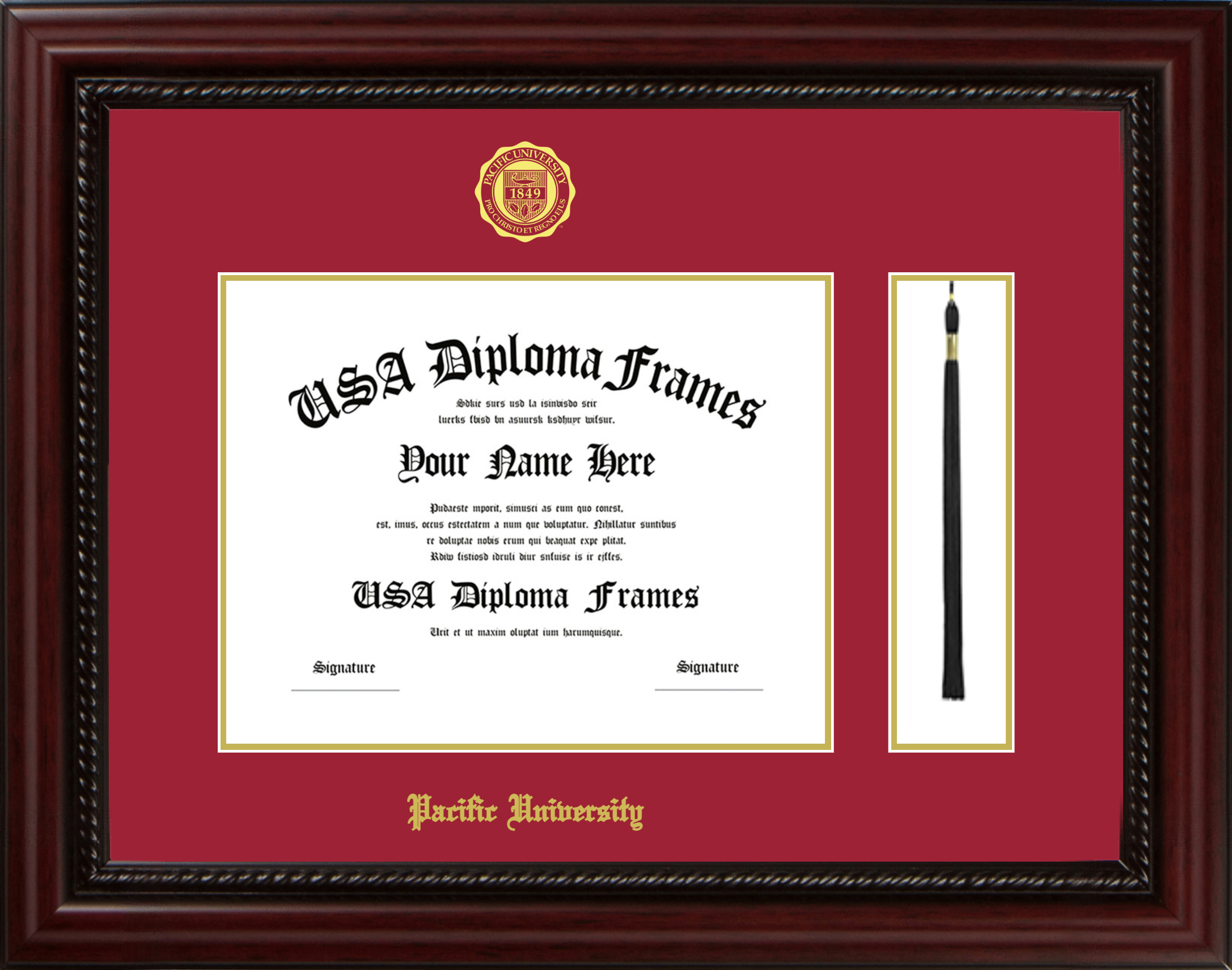 Pacific University Diploma Frame with Tassel – Executive Cherry Rope – Crimson and Gold Mat