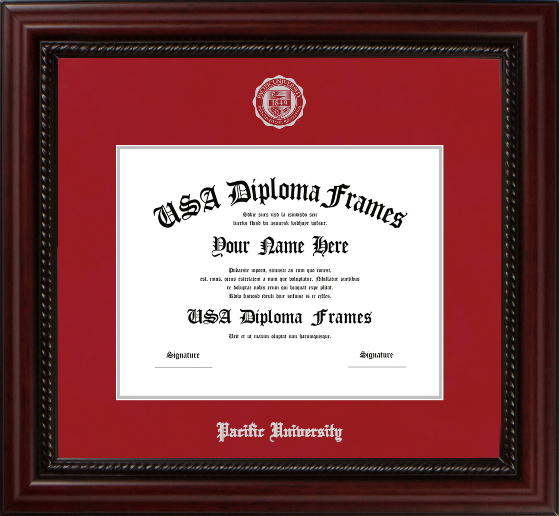 Pacific University – Single Horizontal Document ( Bachelors/Masters ) – Executive Cherry Rope – Crimson Mat – Silver Accent Mat – With Seal(University Seal Silver) – With Silver Embossing (Pacific University)