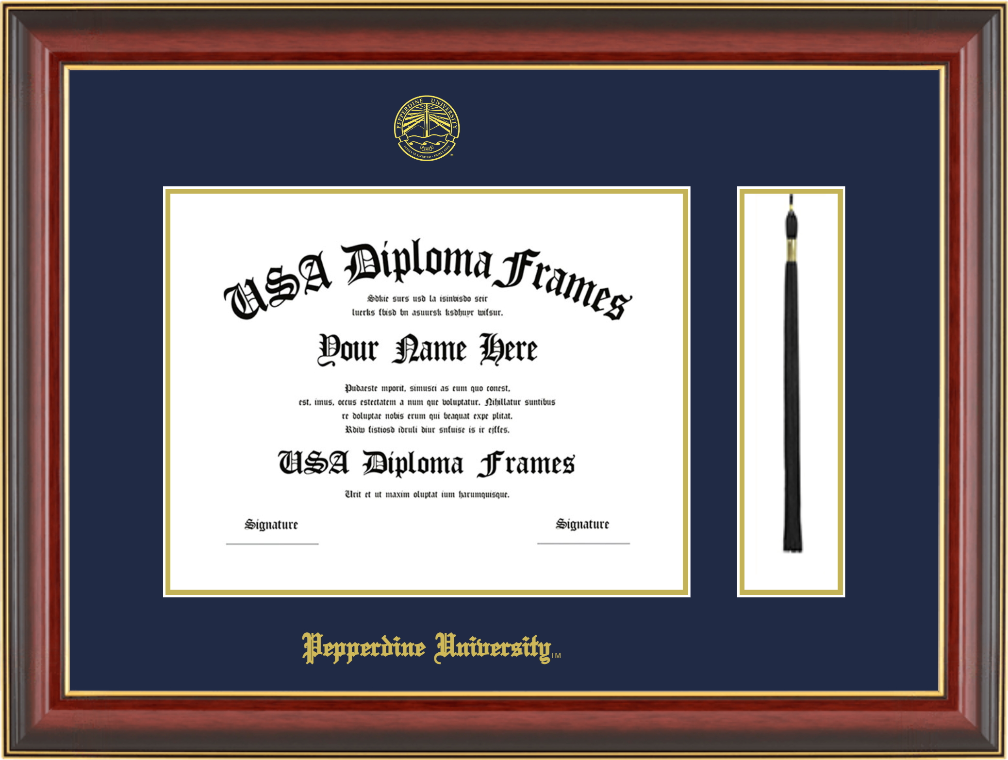 Pepperdine University Diploma Frame with Tassel – 8.5×11 Bachelors/Masters – Cherry Mahogany Gold Trim Glossy – Navy and Gold Mat