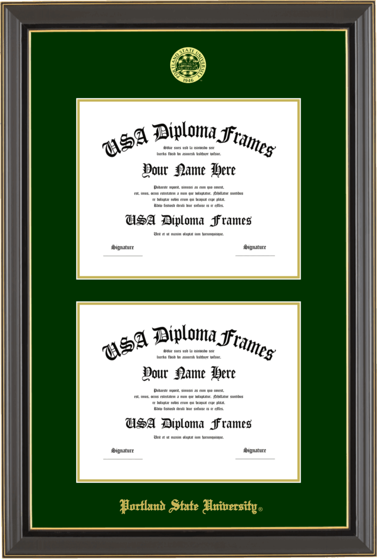 Portland State University Double Diploma Frame – Double Document – Black Gold Trim Glossy – Winter Green and Gold Mat