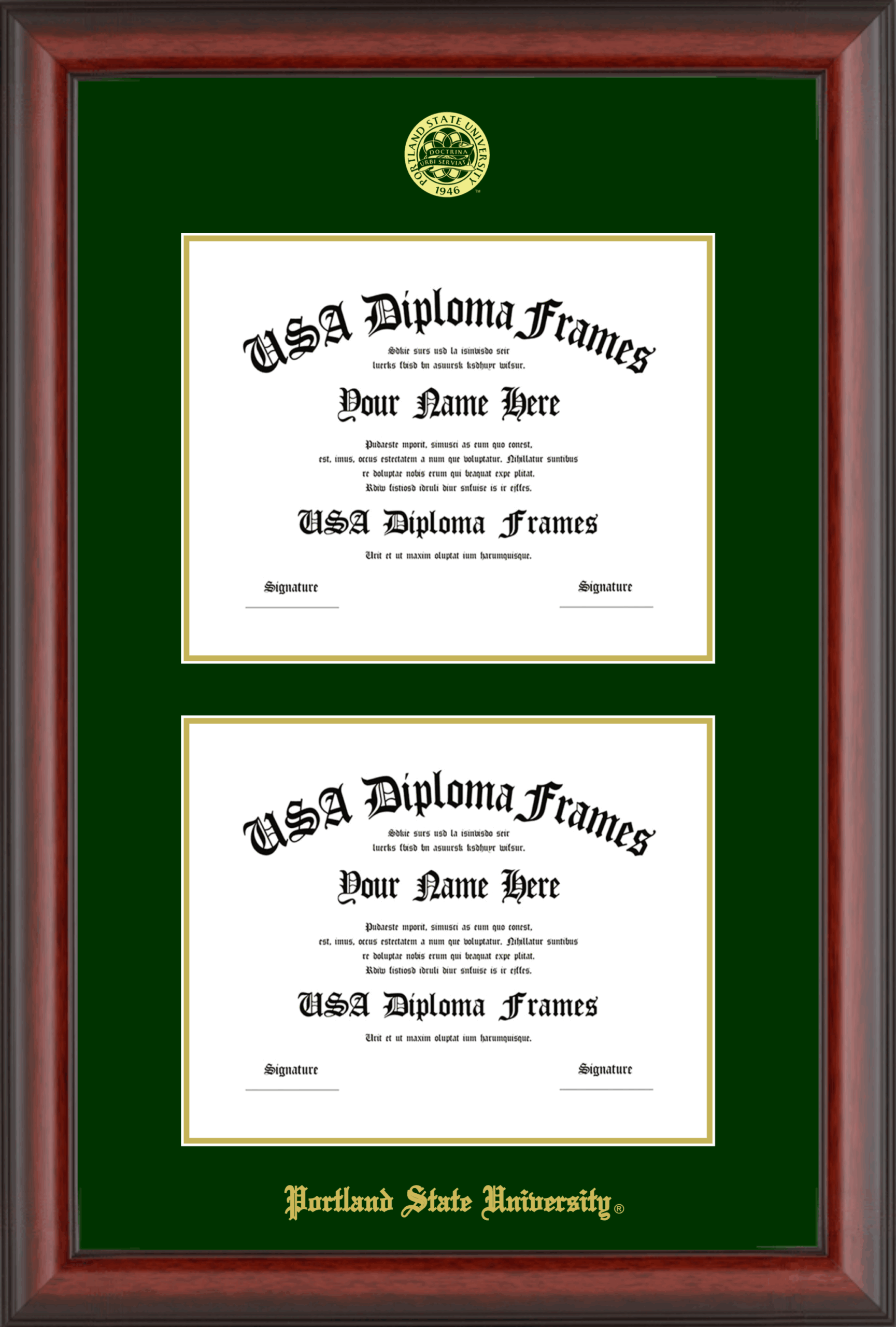 Portland State University Double Diploma Frame – Double Document – Cherry Mahogany Matte – Winter Green and Gold Mat