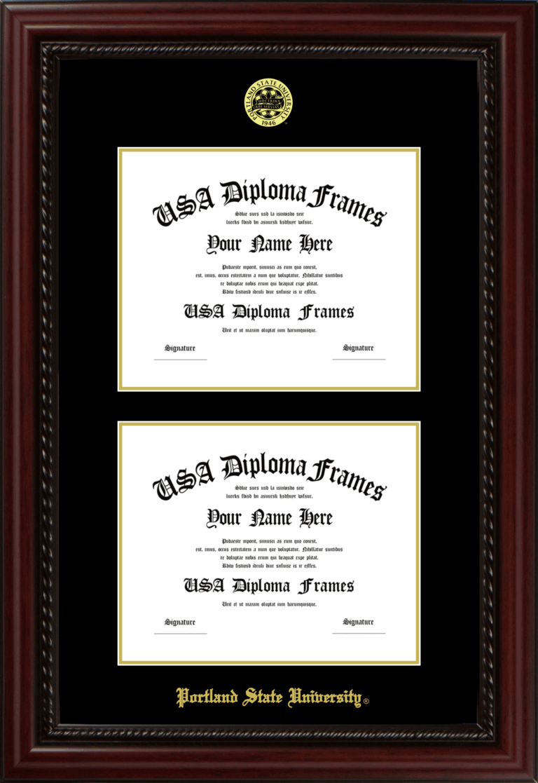 Portland State University Double Diploma Frame – Double Document – Executive Cherry Rope – Black and Gold Mat