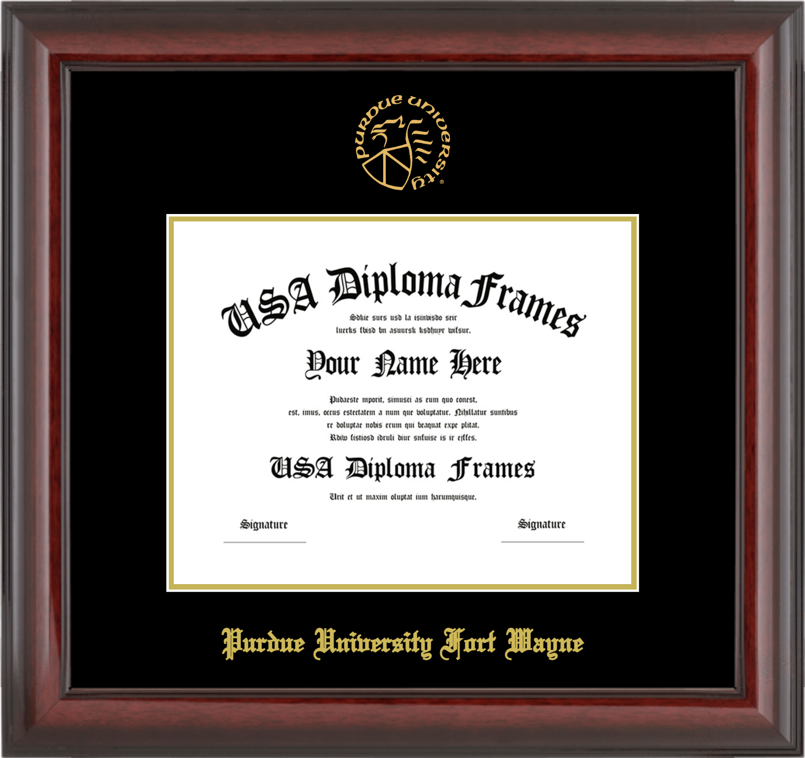 Purdue University Fort Wayne Diploma Frame – Cherry Mahogany Glossy – Black and Gold Mat
