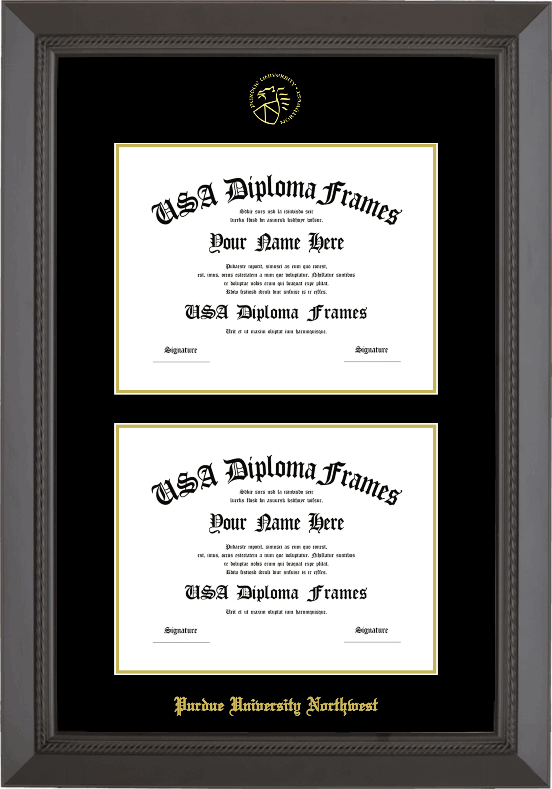 Purdue University Northwest Double Diploma Frame – Double Document – Black Rope – Black and Gold Mat