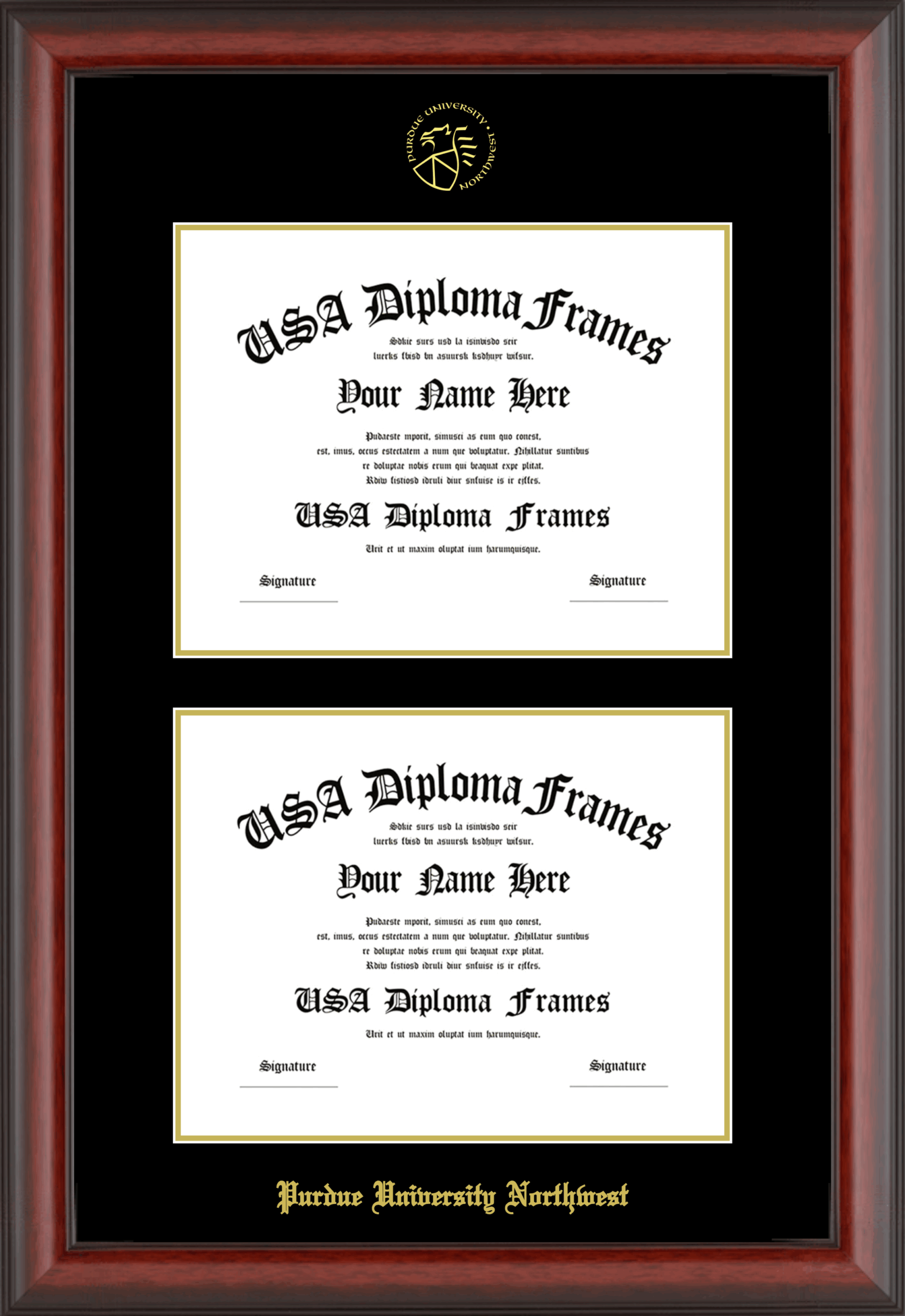 Purdue University Northwest Double Diploma Frame – Double Document – Cherry Mahogany Matte – Black and Gold Mat
