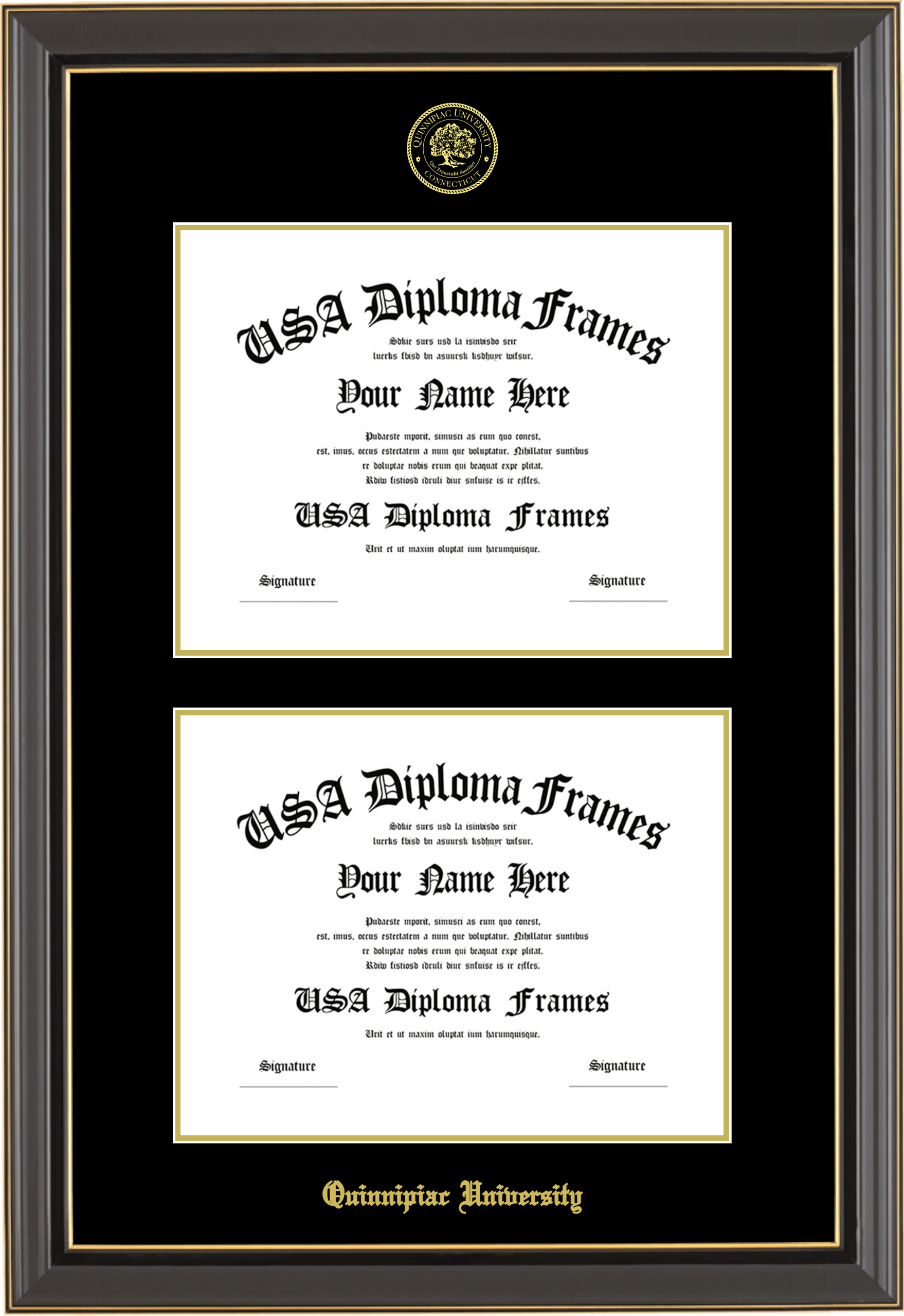 Quinnipiac University Double Diploma Frame – Double Document – Black Gold Trim Glossy – Black and Gold Mat