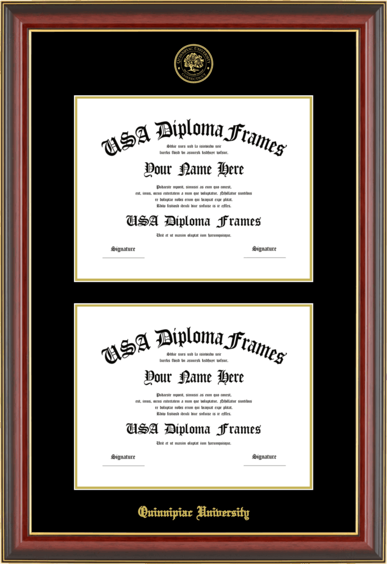 Quinnipiac University Double Diploma Frame – Double Document – Cherry Mahogany Gold Trim Glossy – Black and Gold Mat