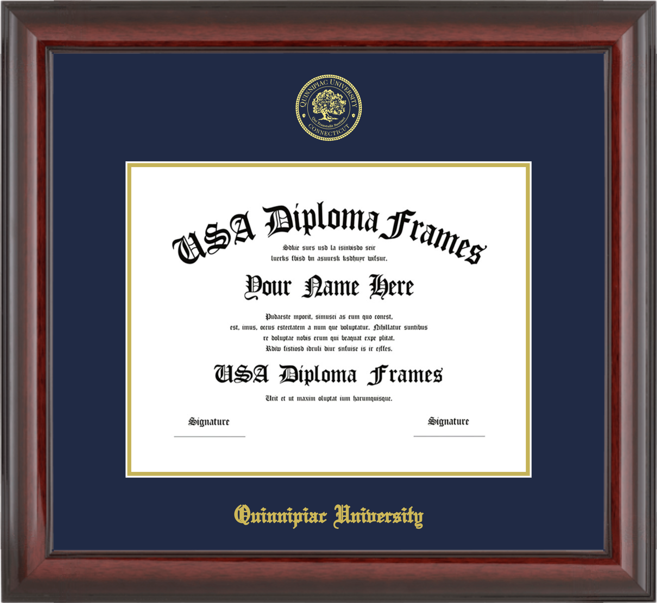 Quinnipiac University – Single Horizontal Document ( Bachelors ) – Cherry Mahogany Glossy – Navy Mat – Gold Accent Mat – With Seal(University Seal Gold) – With Gold Embossing (Quinnipiac University)