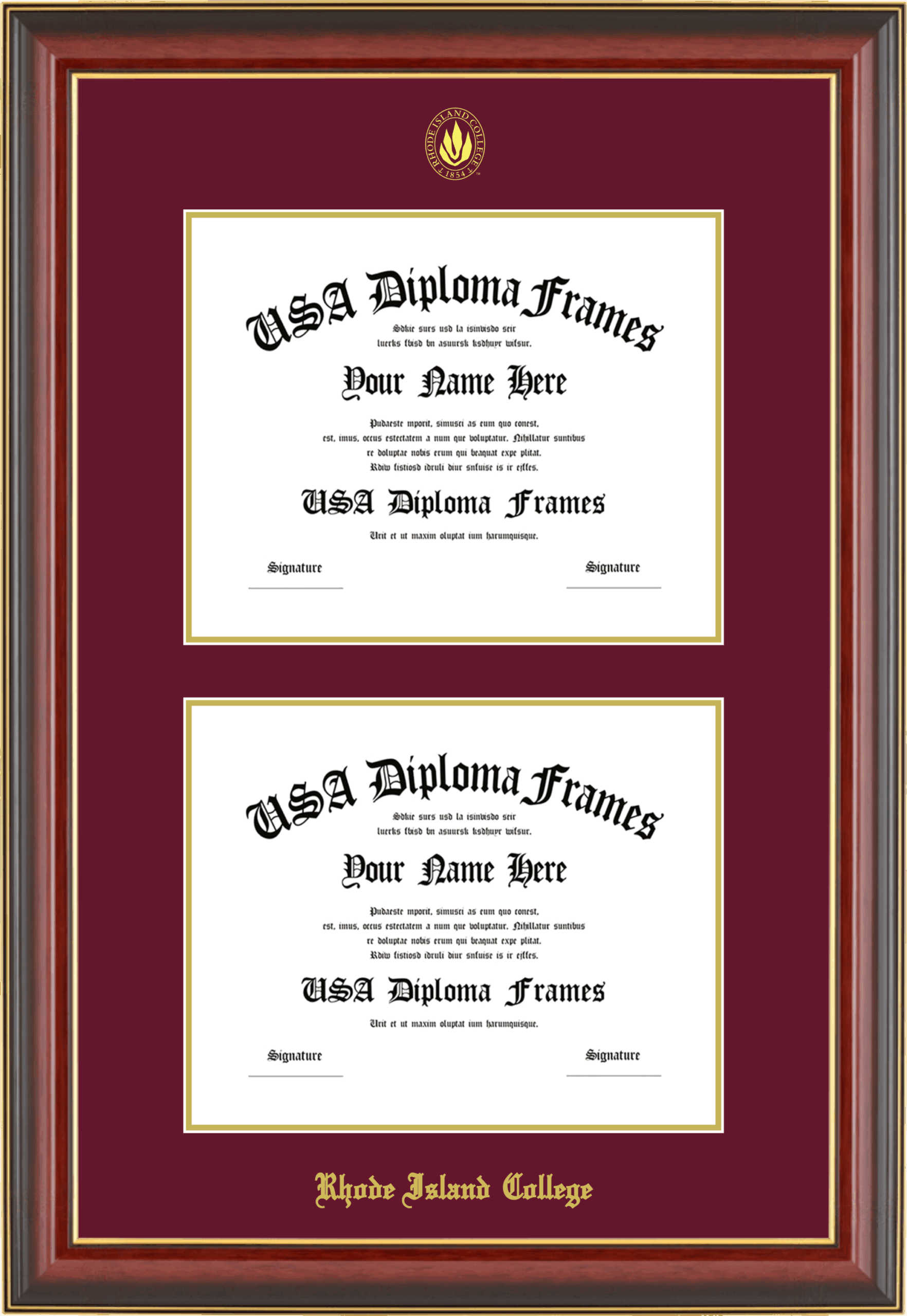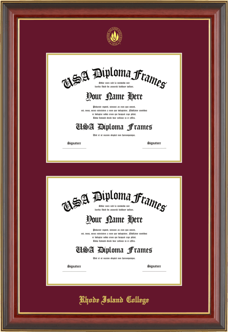 Rhode Island College Double Diploma Frame – Double Document – Cherry Mahogany Gold Trim Glossy – Maroon and Gold Mat