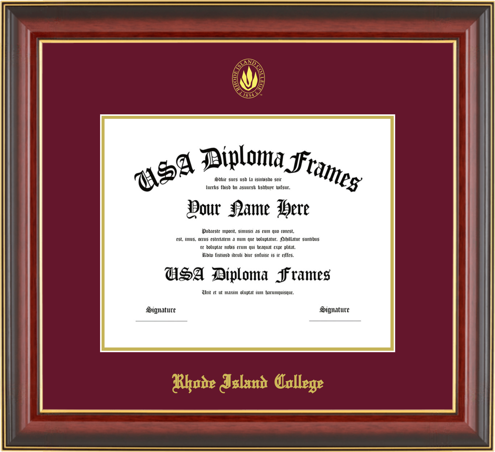 Rhode Island College Diploma Frame – Cherry Mahogany Gold Trim Glossy – Maroon and Gold Mat