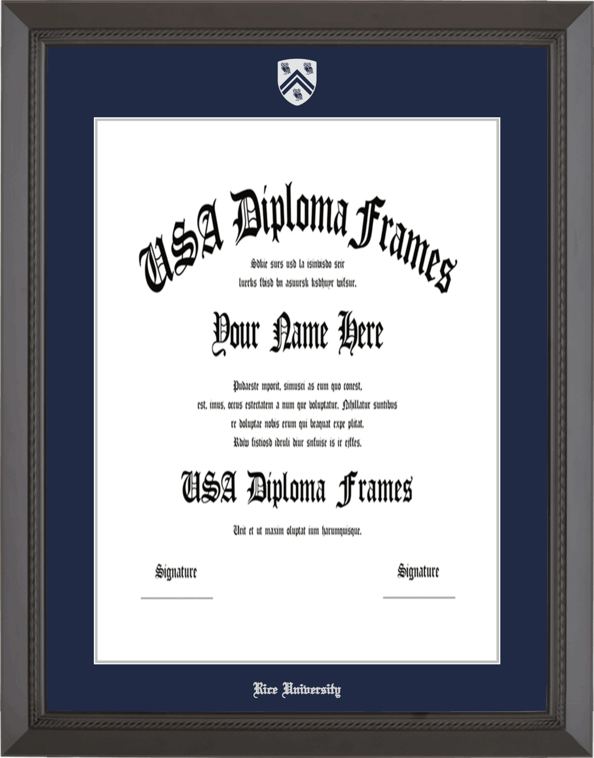 Rice University Diploma Frame – 23×17 – Black Rope – Navy and Silver Mat