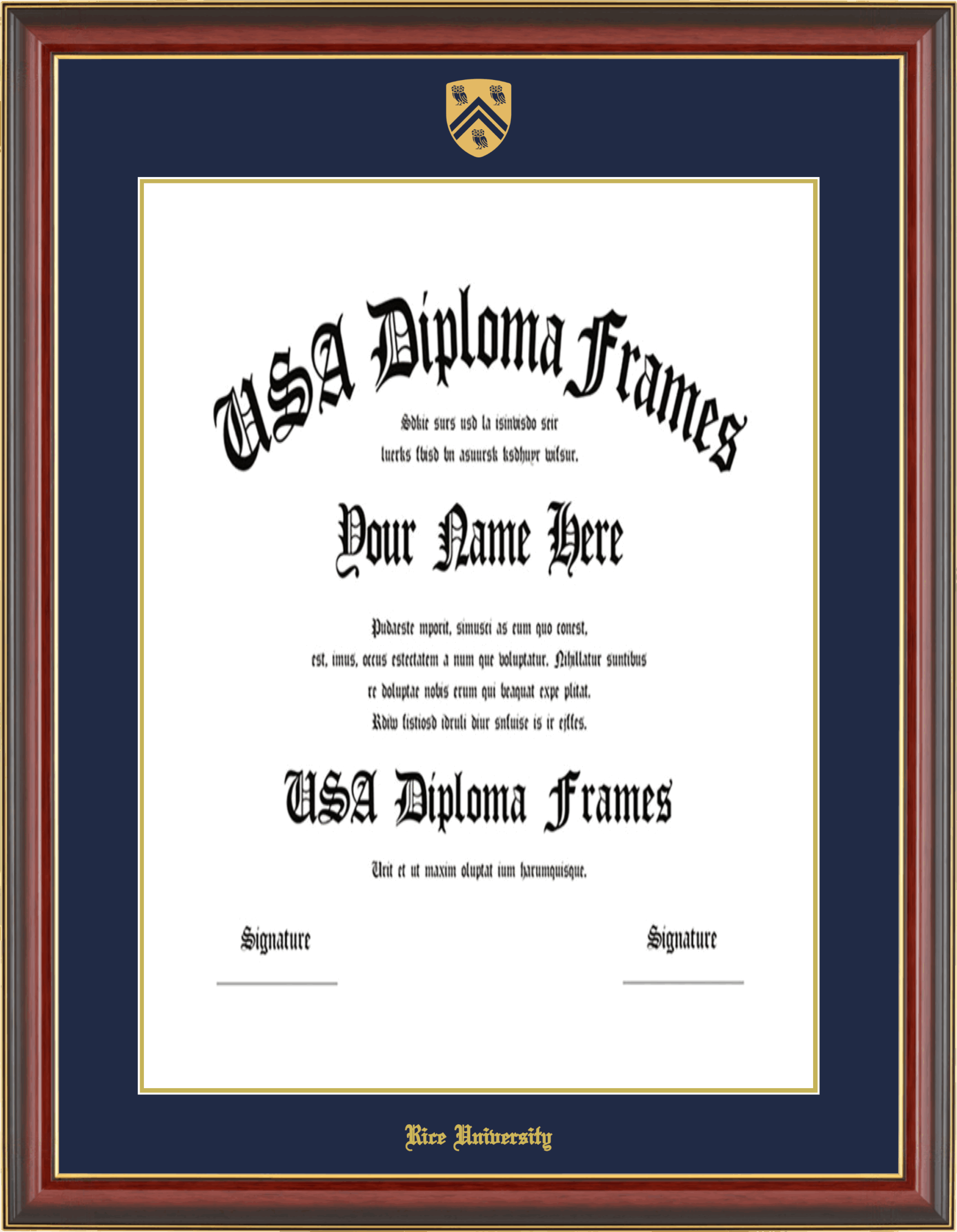 Rice University Diploma Frame – 23×17 – Cherry Mahogany Gold Trim Glossy – Navy and Gold Mat