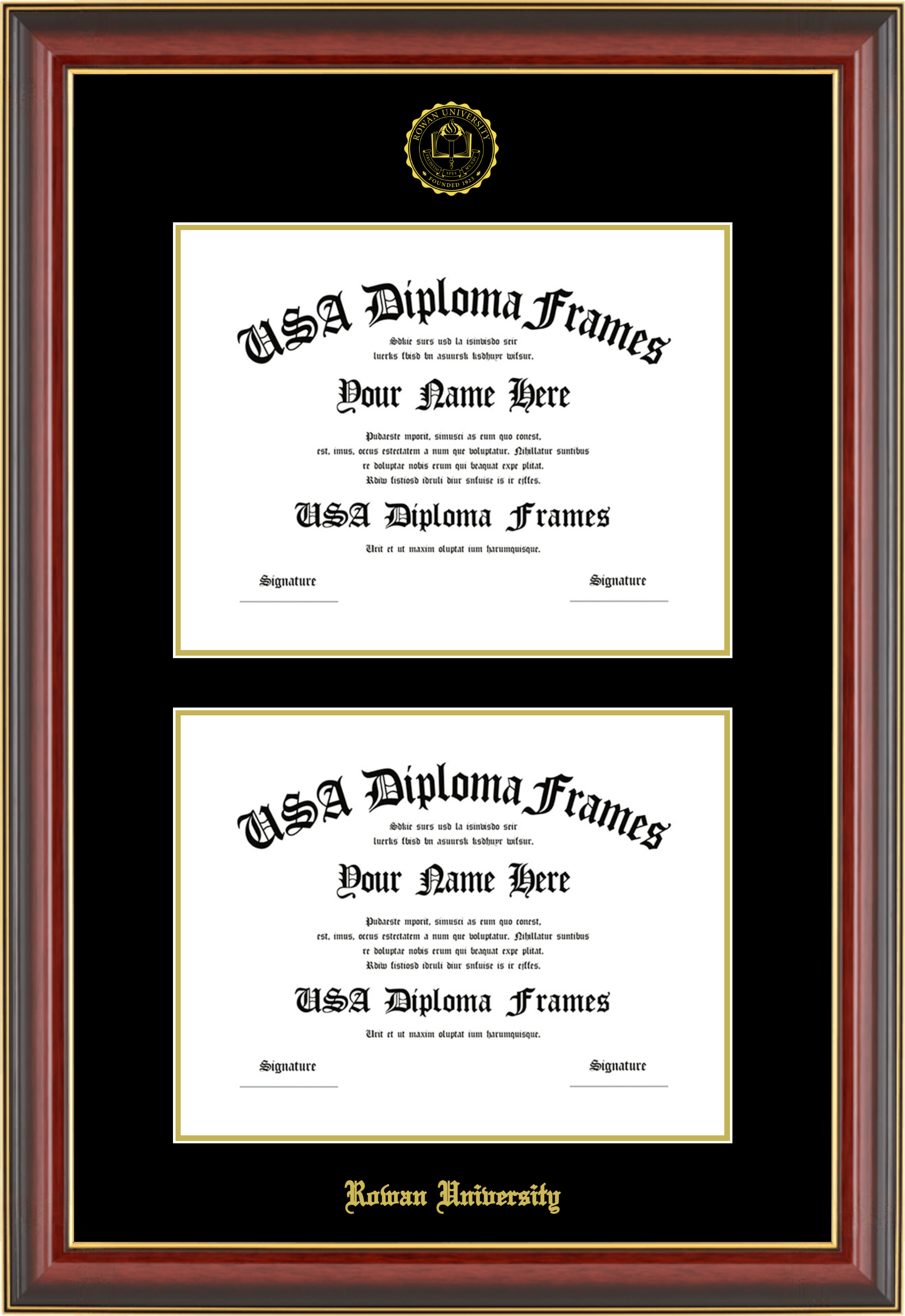 Rowan University Double Diploma Frame – Double Document – Cherry Mahogany Gold Trim Glossy – Black and Gold Mat