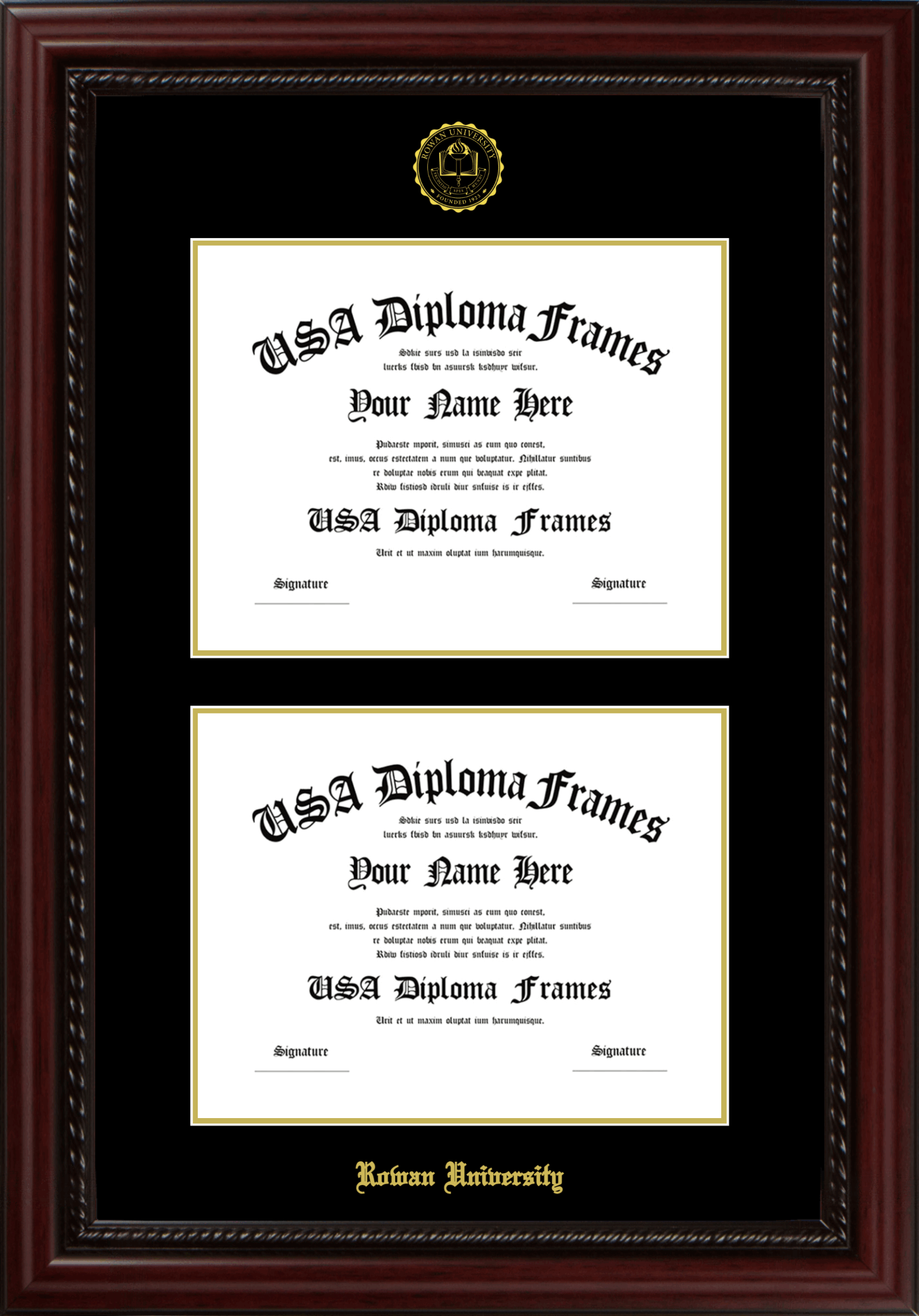 Rowan University Double Diploma Frame – Double Document – Executive Cherry Rope – Black and Gold Mat