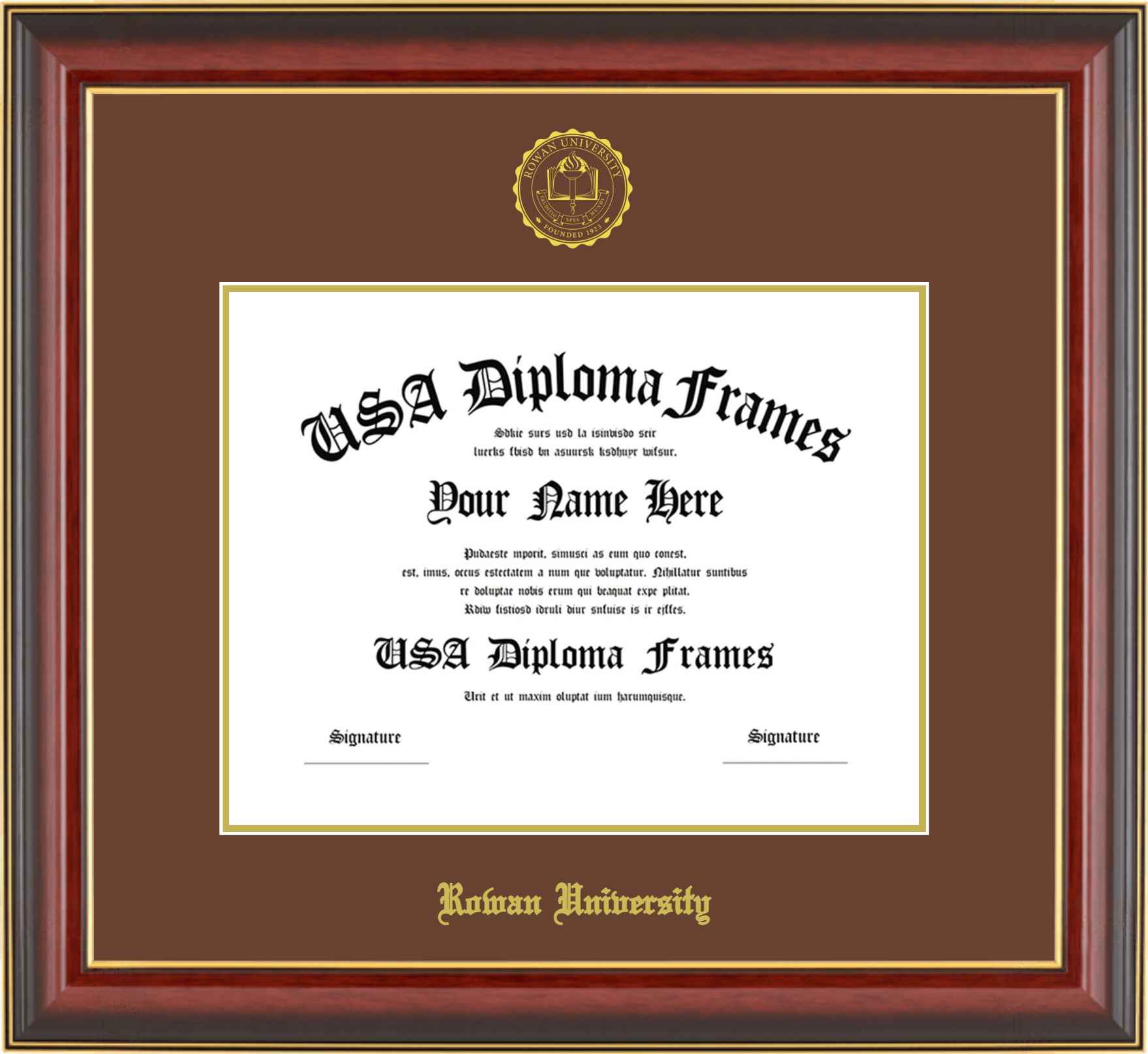 Rowan University – Single Horizontal Document ( Diploma ) – Cherry Mahogany Gold Trim Glossy – Brown Mat – Gold Accent Mat – With Seal(University Seal Gold) – With Gold Embossing (Rowan University)