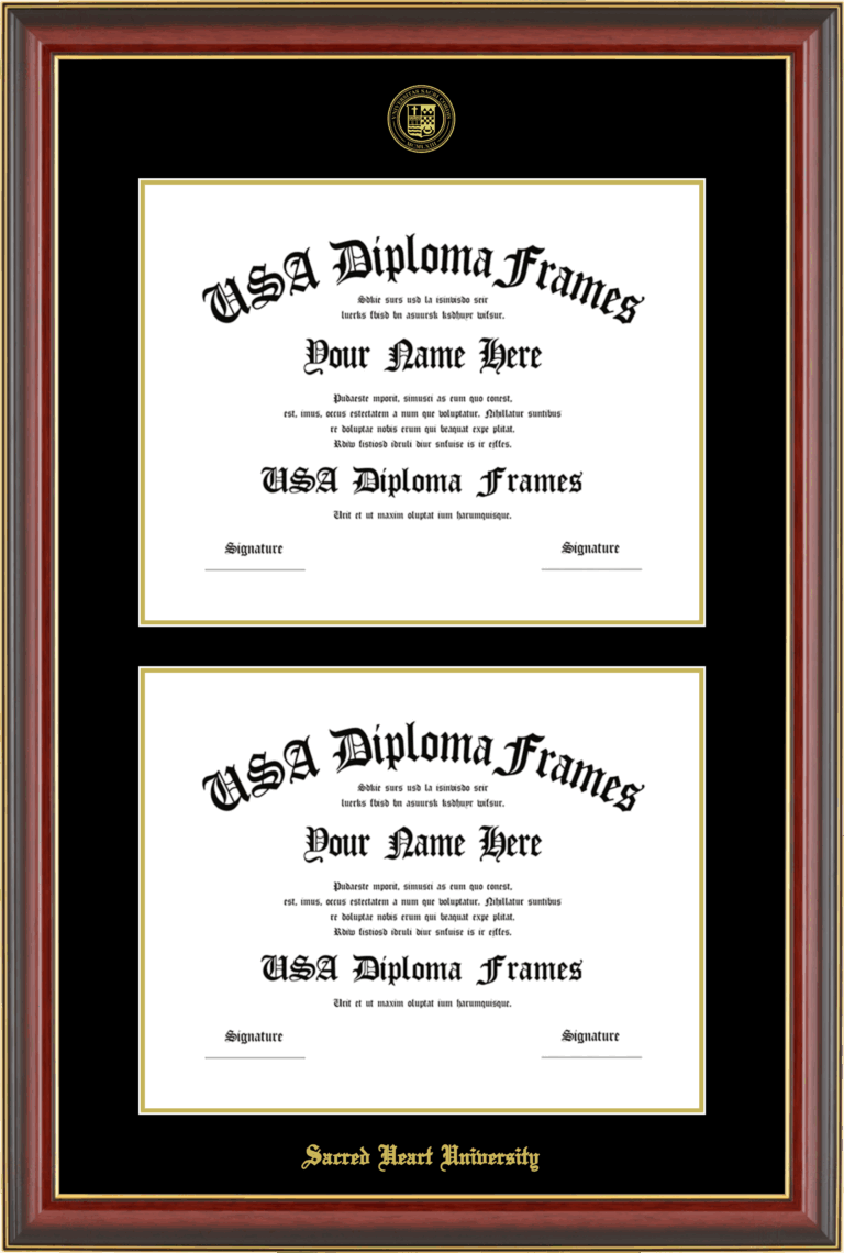 Sacred Heart University Double Diploma Frame – Double Document – Cherry Mahogany Gold Trim Glossy – Black and Gold Mat