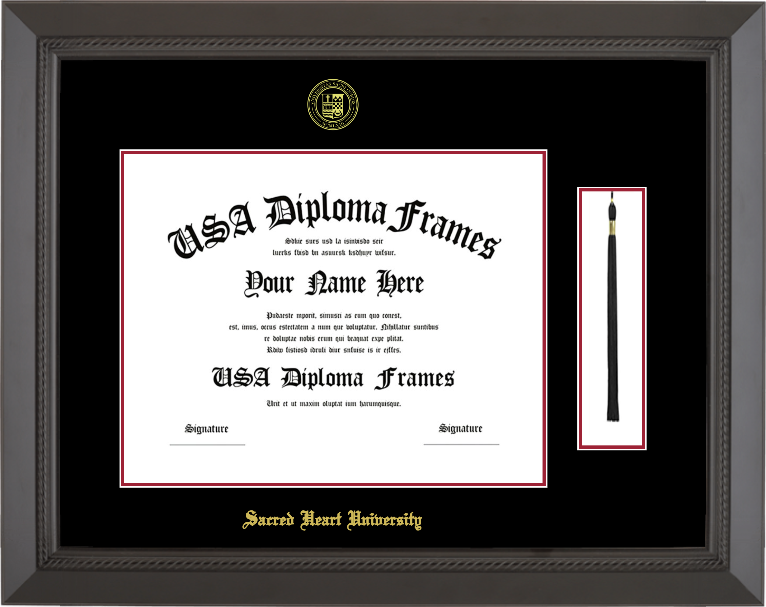 Sacred Heart University Diploma Frame with Tassel – Black Rope – Black and Crimson Mat