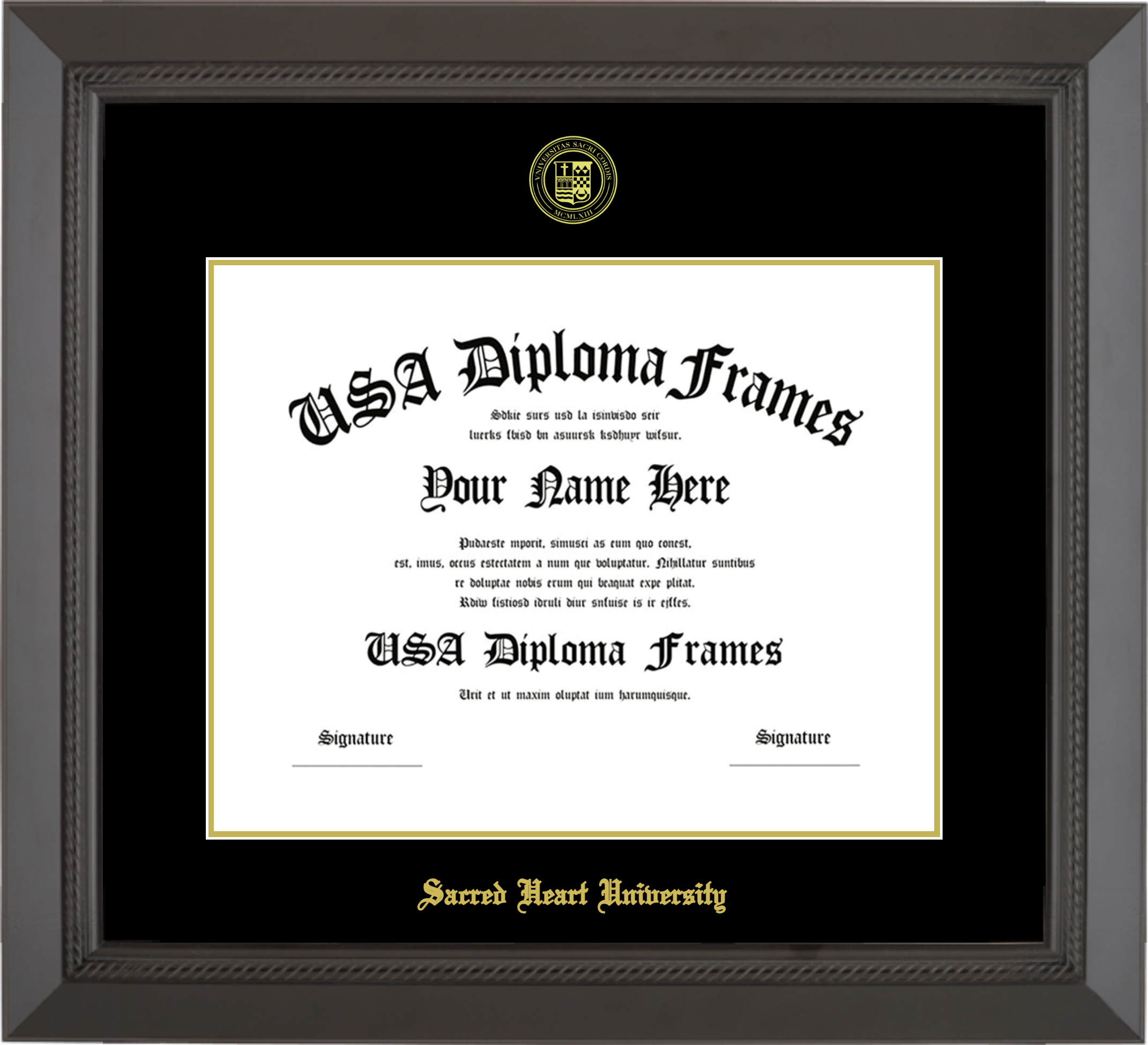 Sacred Heart University Diploma Frame – Black Rope – Black and Gold Mat
