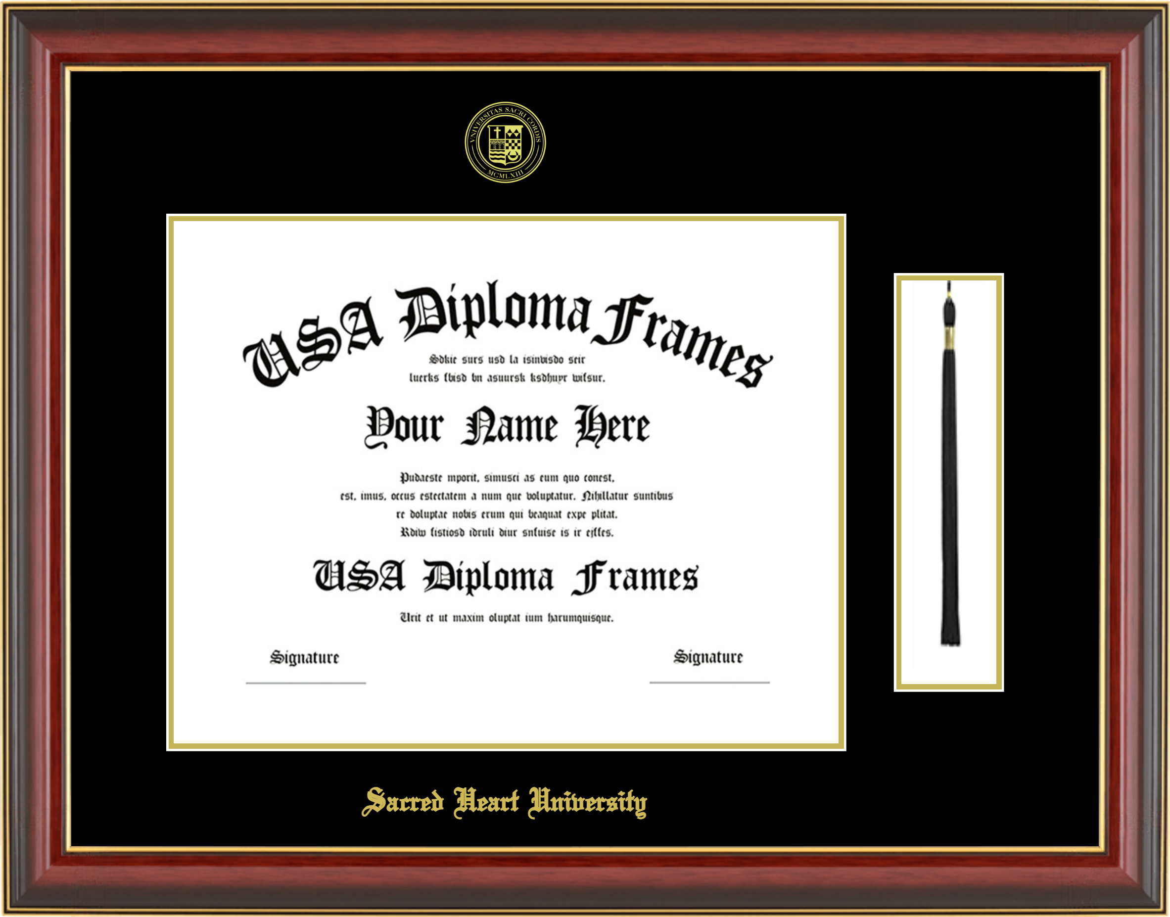 Sacred Heart University Diploma Frame with Tassel – Cherry Mahogany Gold Trim Glossy – Black and Gold Mat