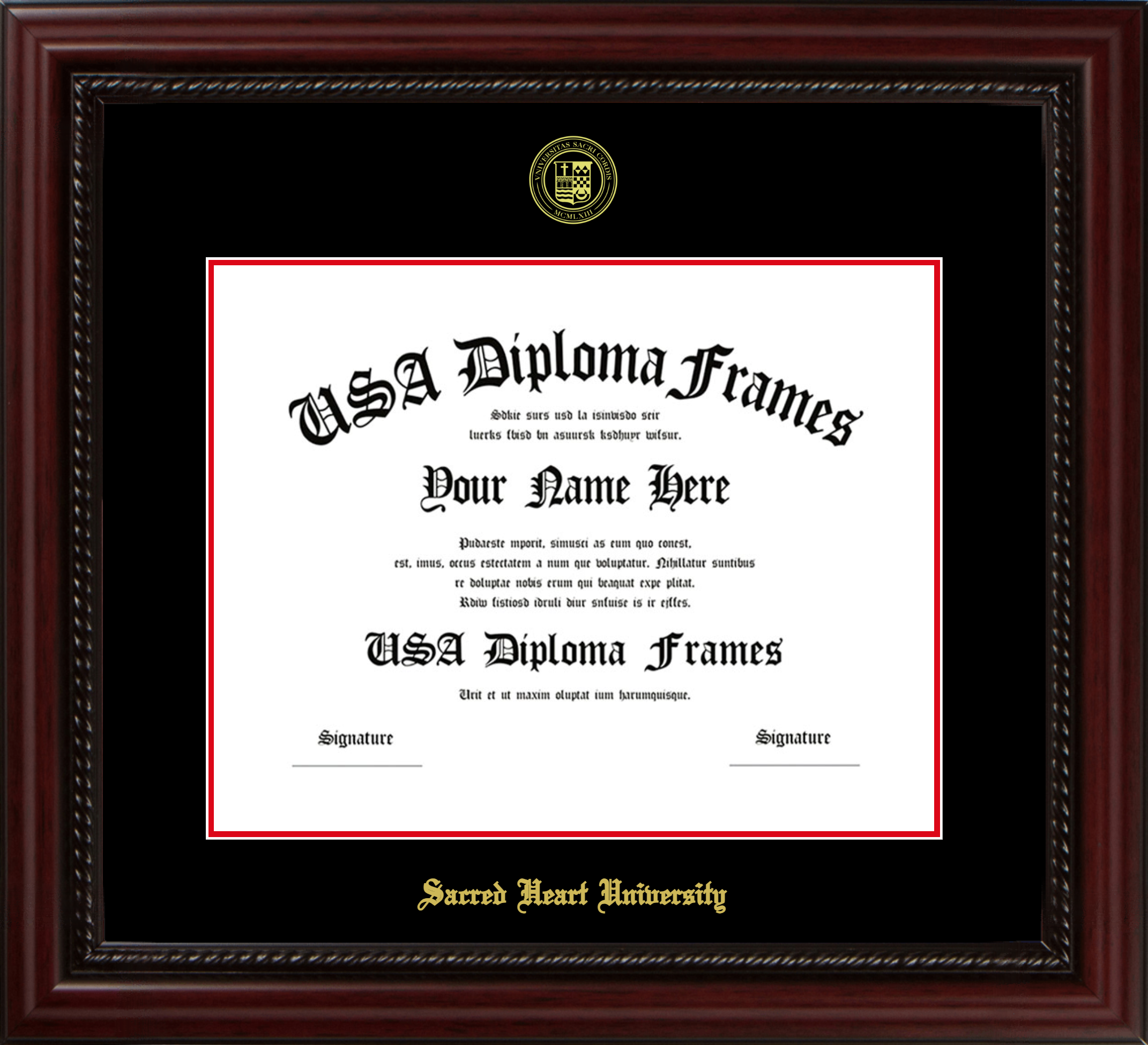 Sacred Heart University Diploma Frame – Executive Cherry Rope – Black and Red Mat