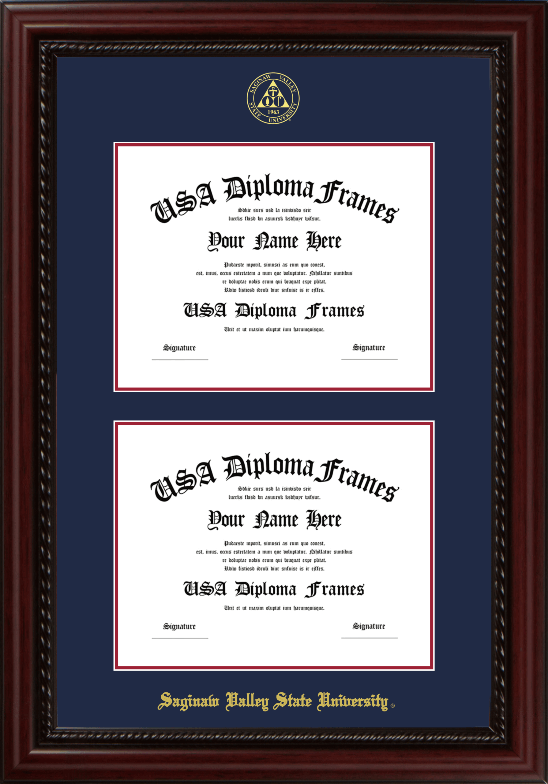 Saginaw Valley State University Double Diploma Frame – Double Document – Executive Cherry Rope – Navy and Crimson Mat