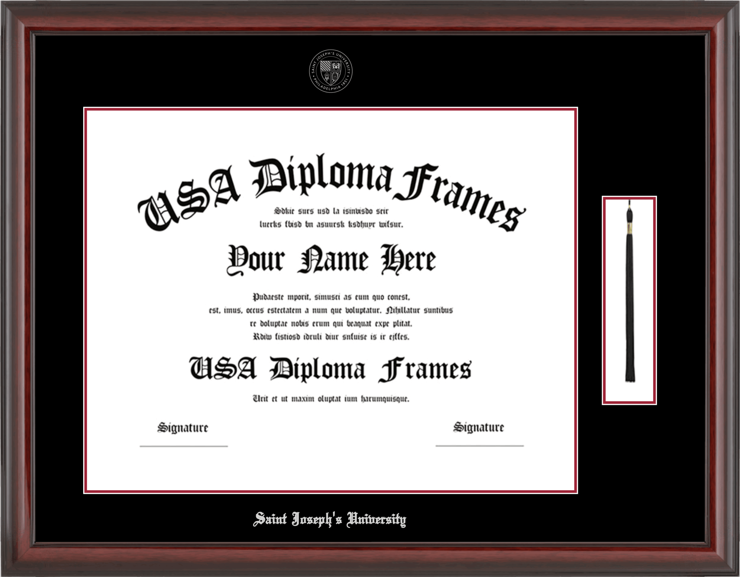 Saint Joseph’s University Diploma Frame with Tassel – Cherry Mahogany Glossy – Black and Crimson Mat – Silver Seal