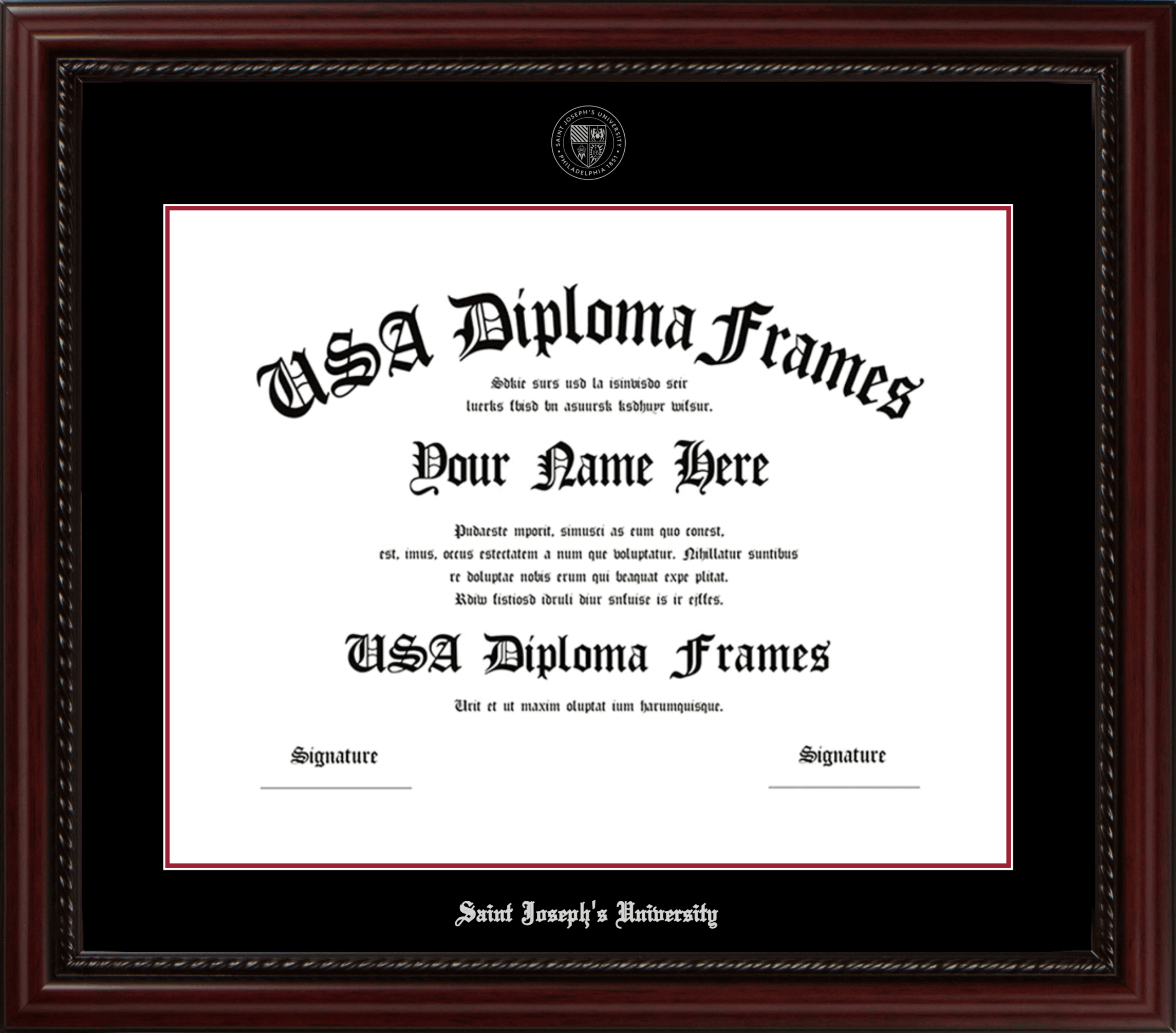 Saint Joseph’s University Diploma Frame – Executive Cherry Rope – Black and Crimson Mat – Silver Seal