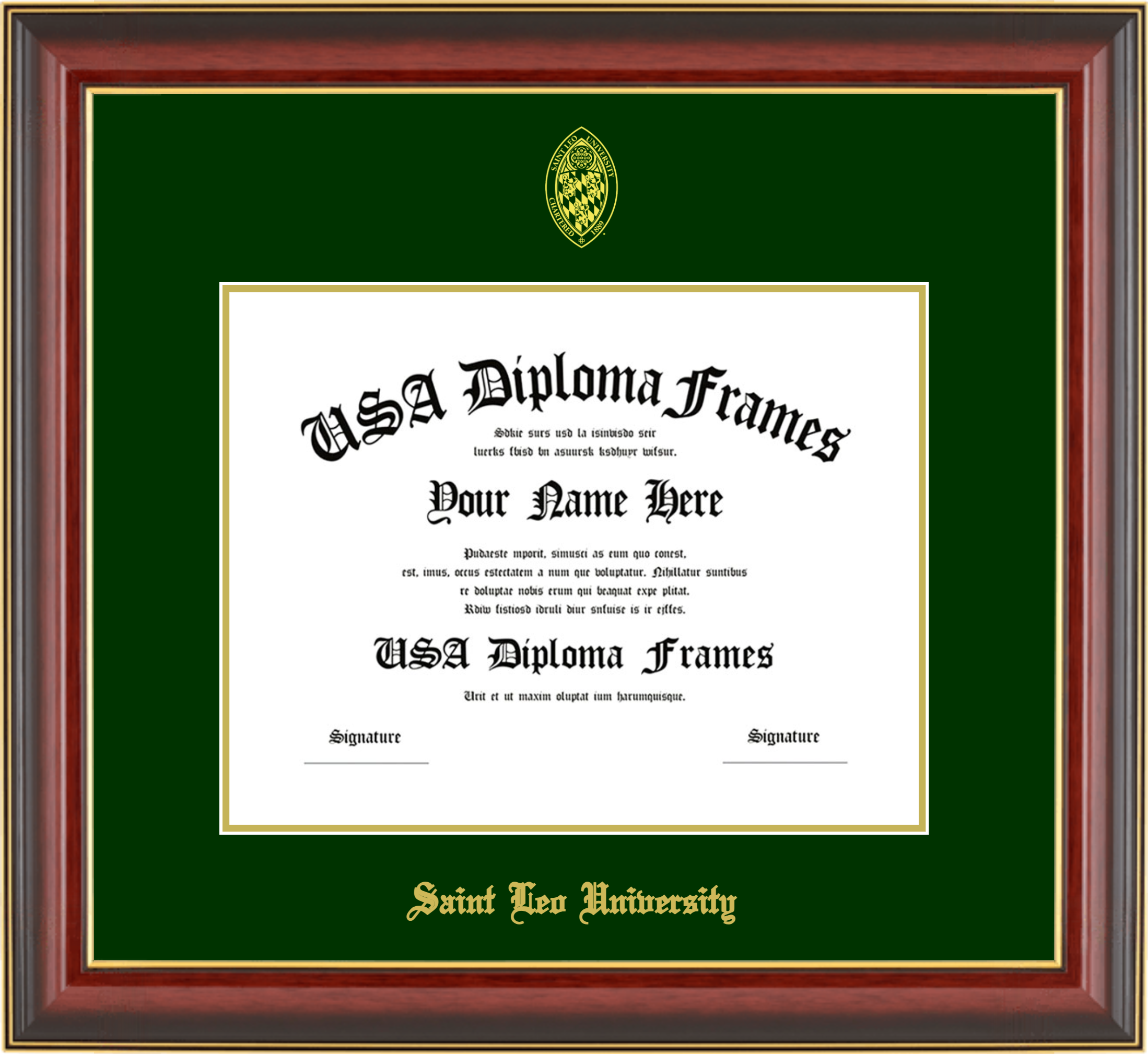 Saint Leo University Diploma Frame – Cherry Mahogany Gold Trim Glossy – Winter Green and Gold Mat