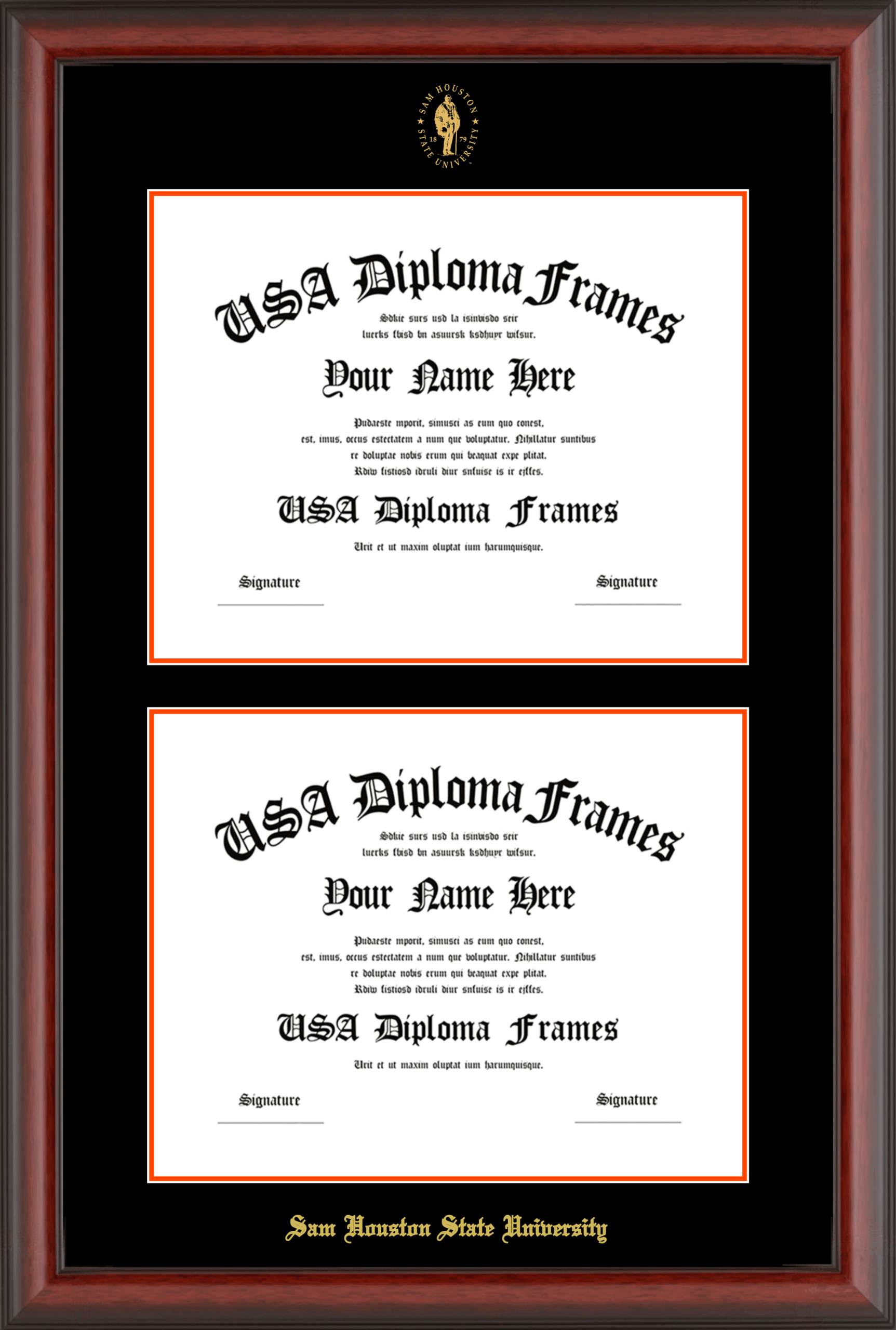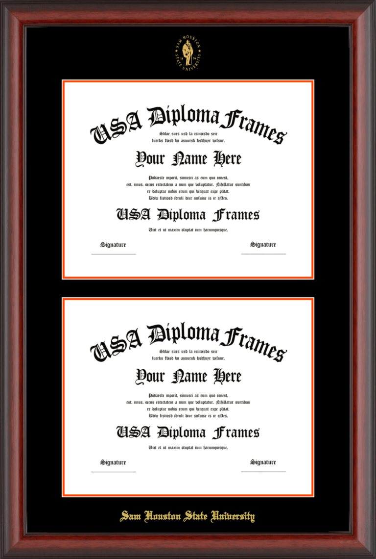 Sam Houston State University Double Diploma Frame – Double Document – Cherry Mahogany Matte – Black and Orange Mat