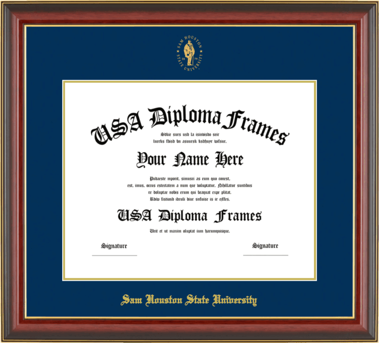 Sam Houston State University Diploma Frame – Cherry Mahogany Gold Trim Glossy – Navy and Gold Mat