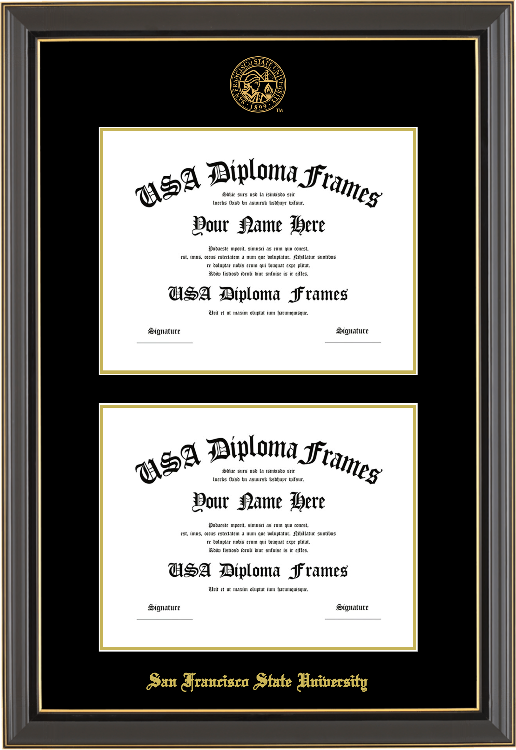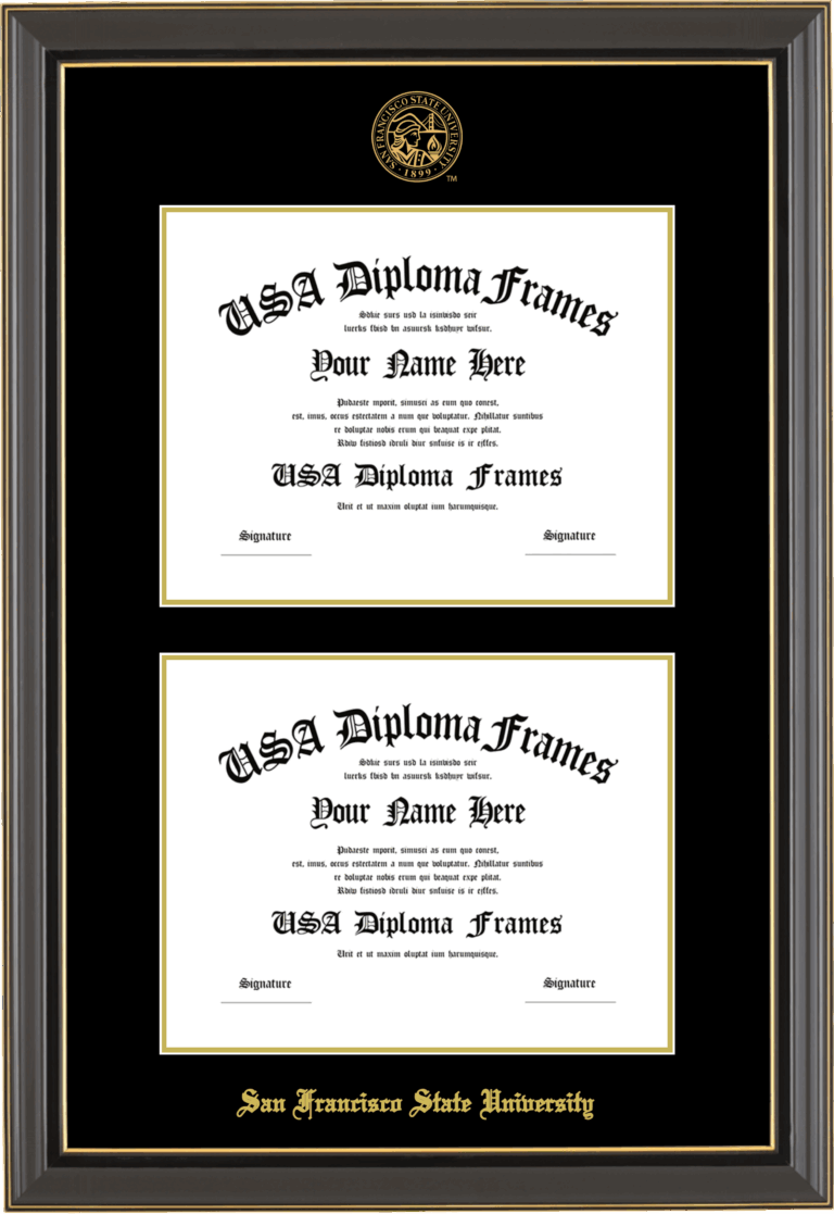 San Francisco State University Double Diploma Frame – Double Document – Black Gold Trim Glossy – Black and Gold Mat