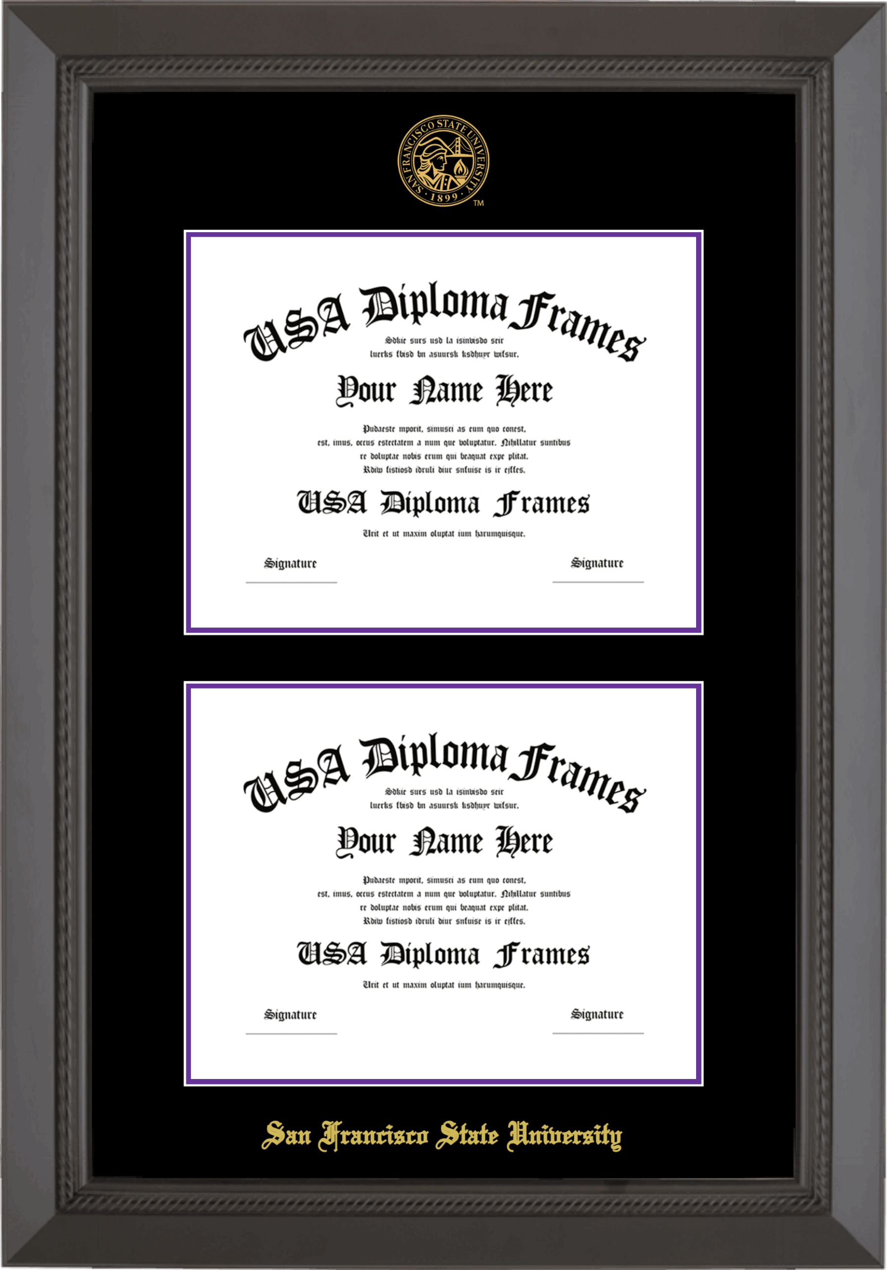 San Francisco State University Double Diploma Frame – Double Document – Black Rope – Black and Purple Mat
