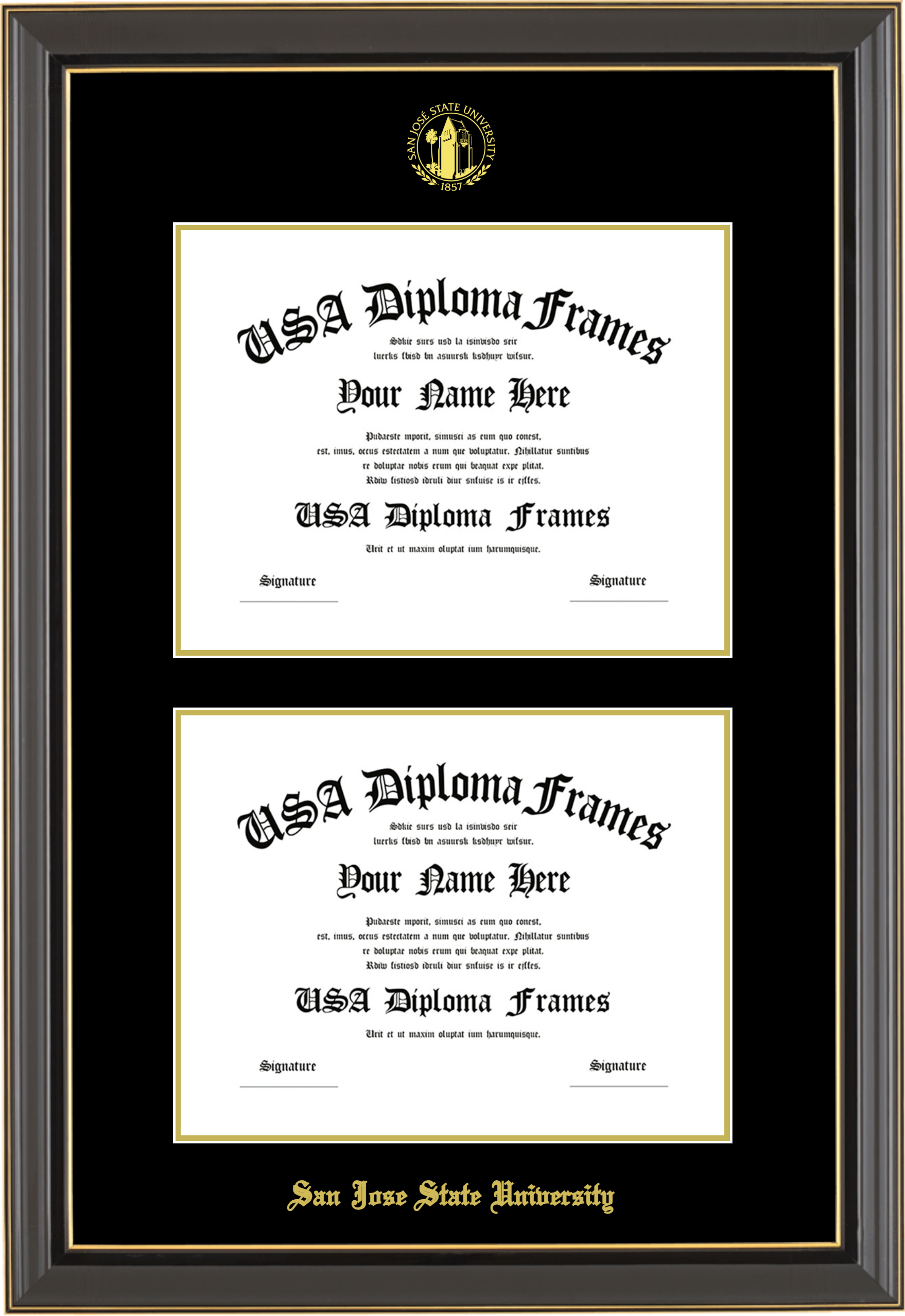 San Jose State University Double Diploma Frame – Double Document – Black Gold Trim Glossy – Black and Gold Mat