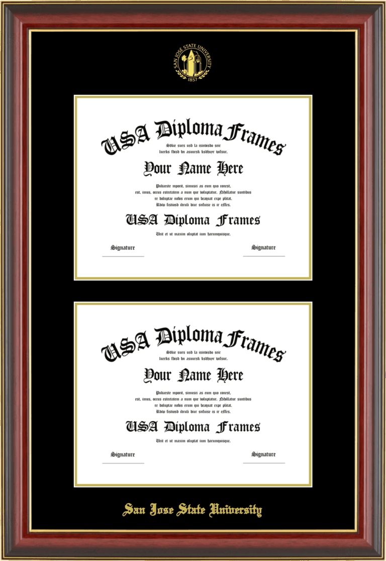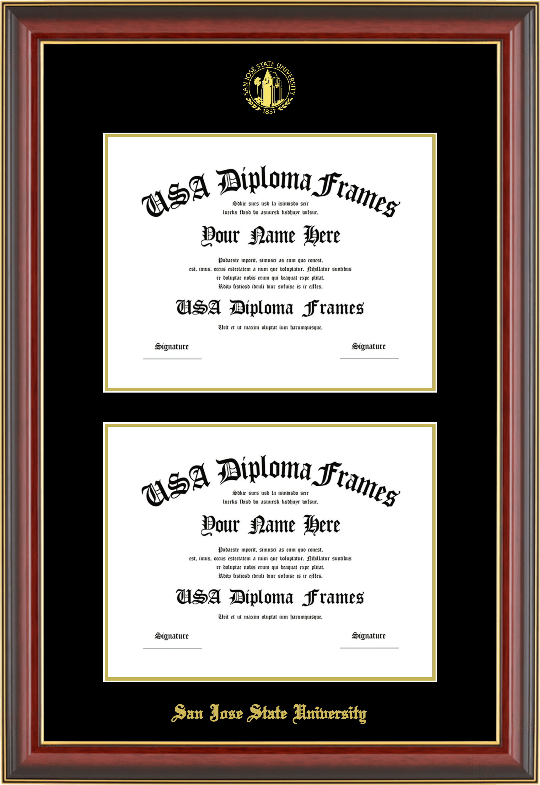 San Jose State University Double Diploma Frame – Double Document – Cherry Mahogany Gold Trim Glossy – Black and Gold Mat