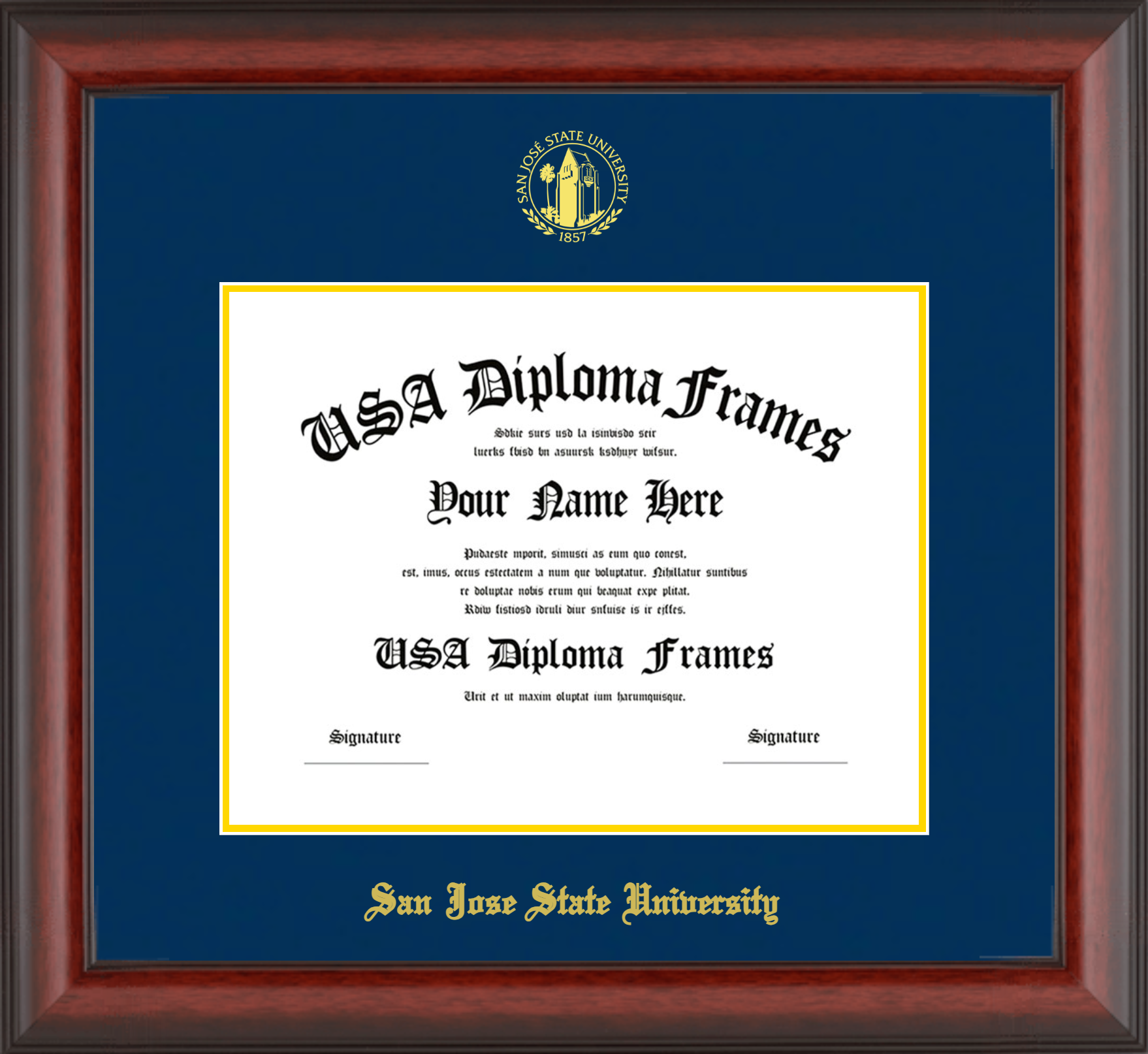 San Jose State University Diploma Frame – Cherry Mahogany Matte – Navy and Yellow Gold Mat