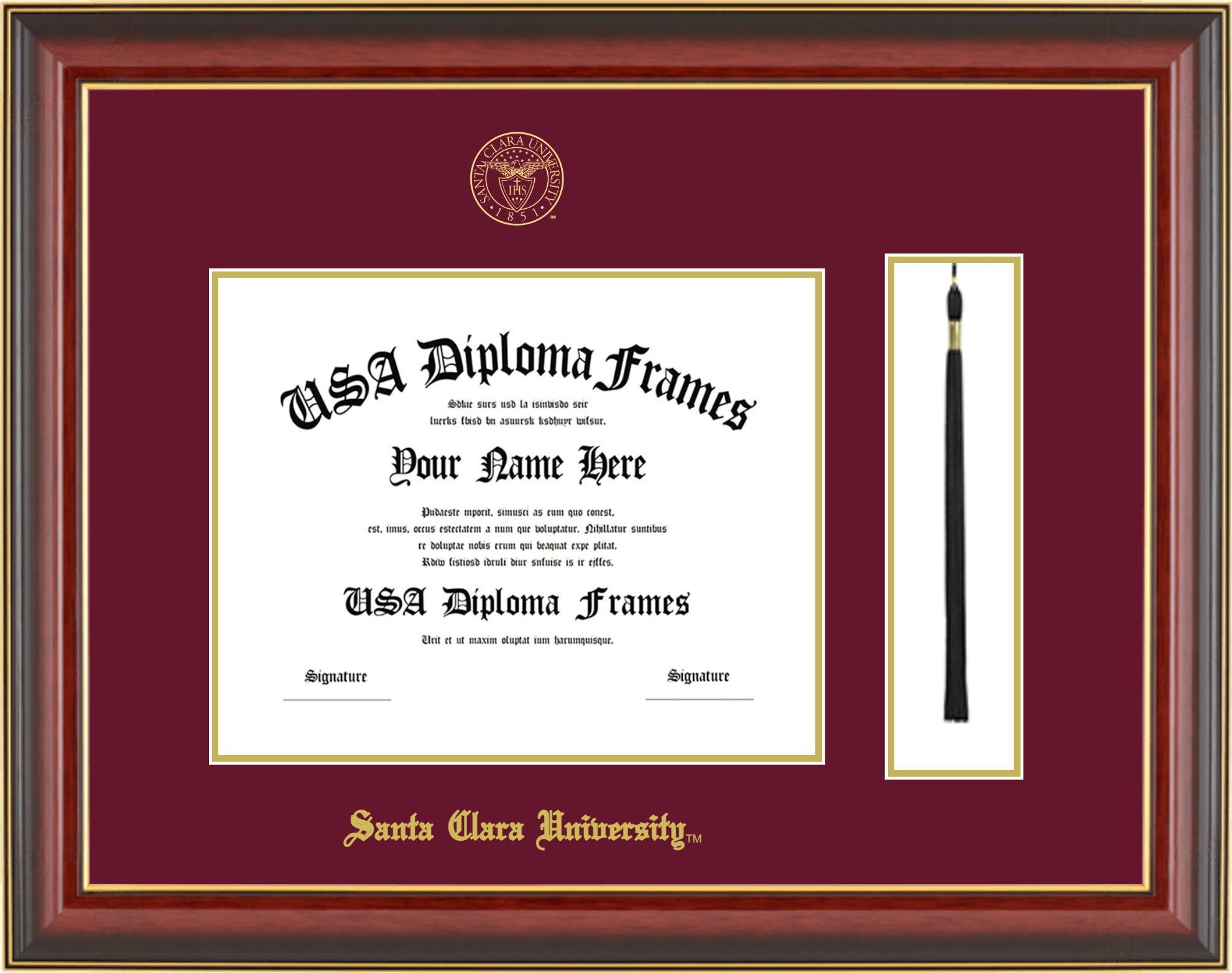 Santa Clara University Diploma Frame with Tassel – Cherry Mahogany Gold Trim Glossy – Maroon and Gold Mat