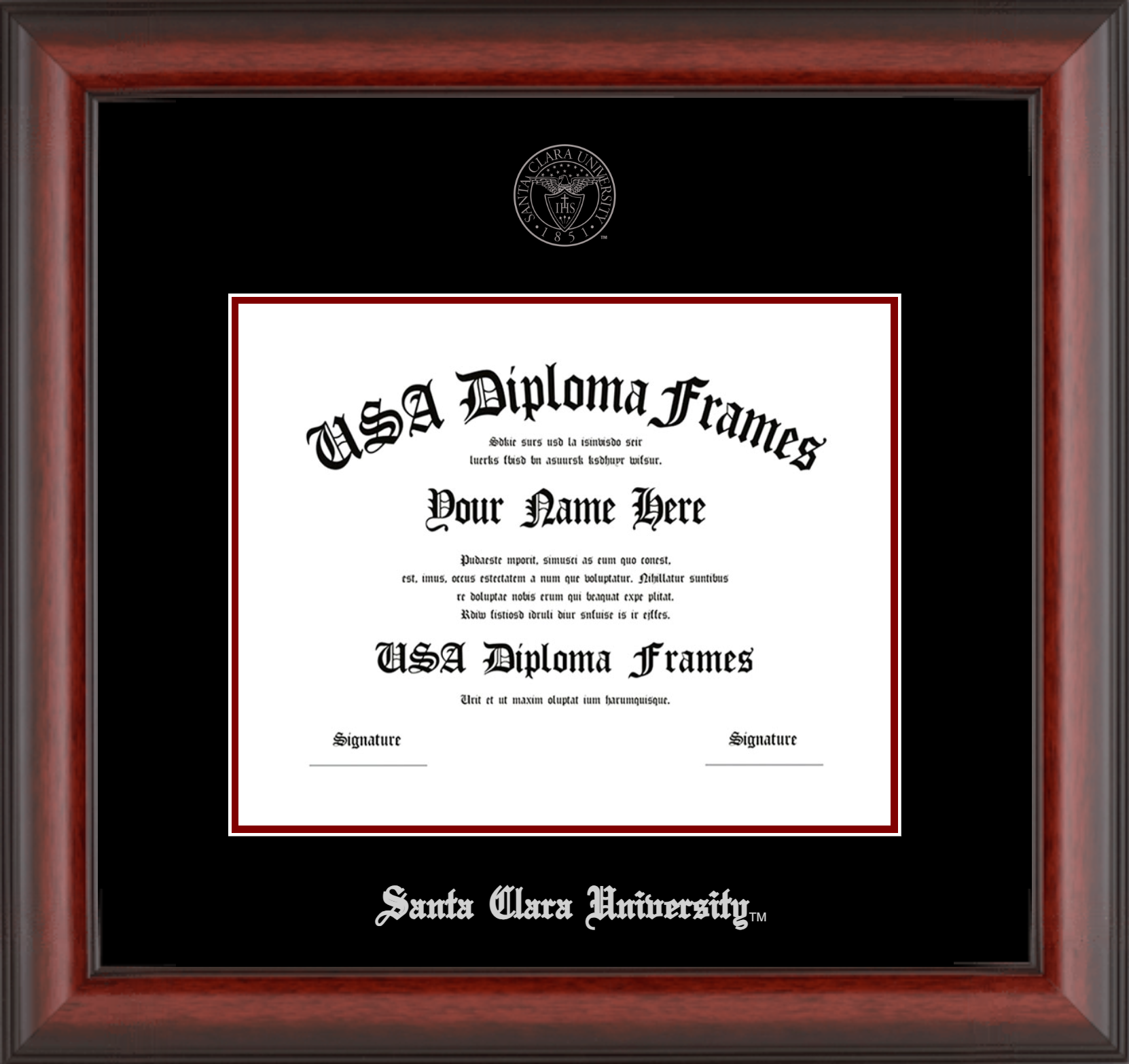 Santa Clara University Diploma Frame – Cherry Mahogany Matte – Black and Maroon Mat – Silver Seal