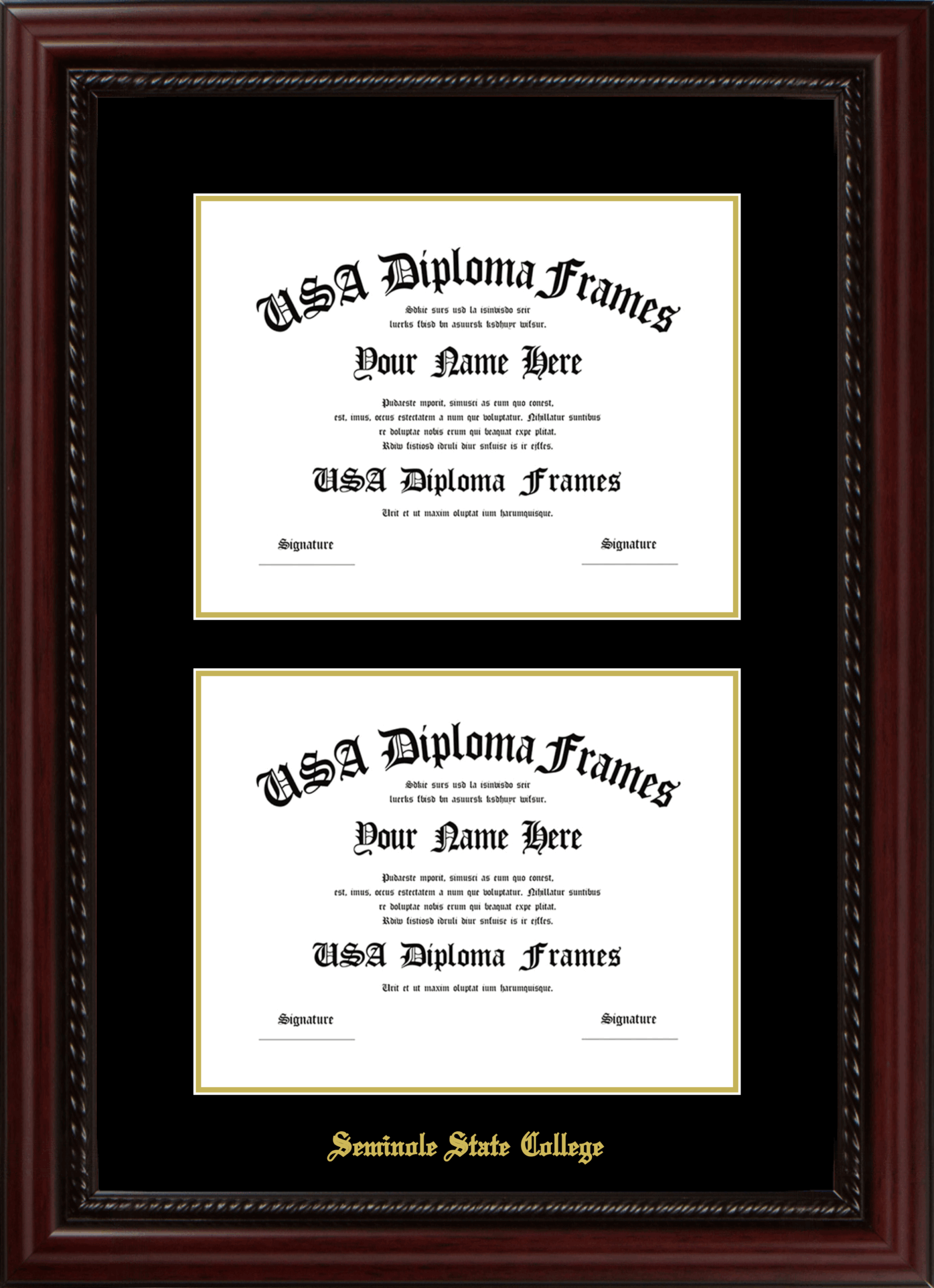 Seminole State College Double Diploma Frame – Double Document – Executive Cherry Rope – Black and Gold Mat
